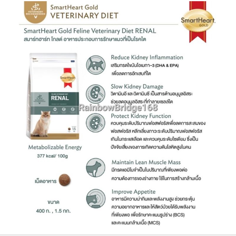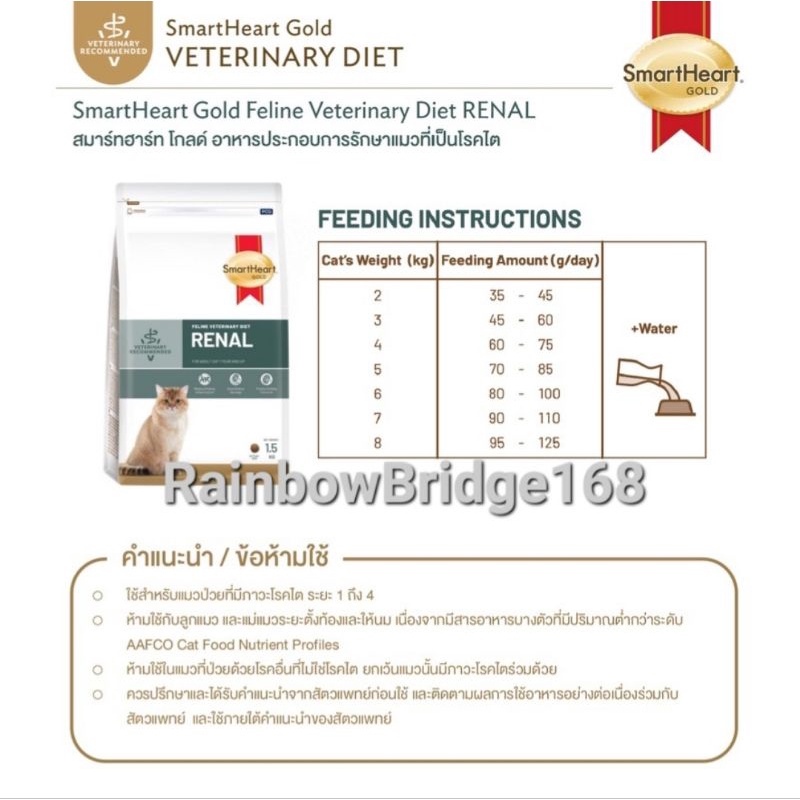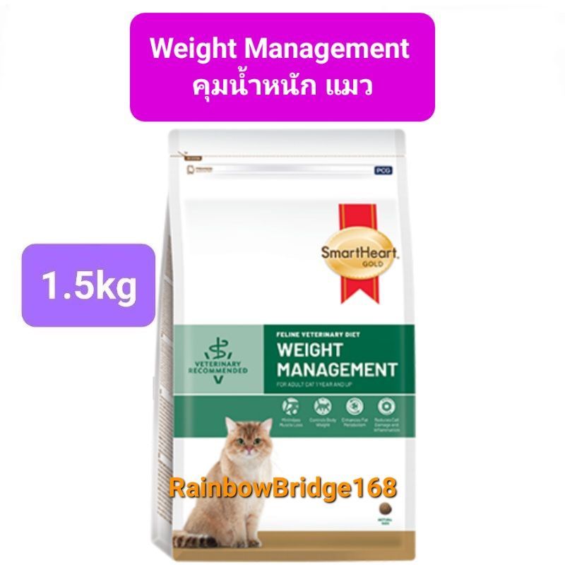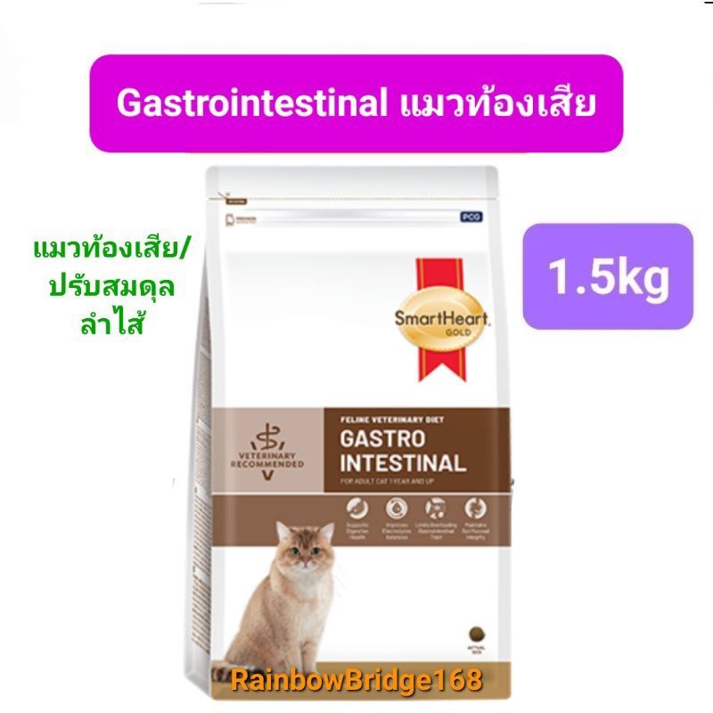 ... line Veterinary Diet RENAL 1.5kg Recommended and suitable for cats with chronic kidney disease 3.SmartHeart Gold WEIGHT MANAGEMENT Cat สมาร์ทฮาร์ท โกลด์ อาหารประกอบการควบคุมน้ำหนักสำหรับแมว สูตรอาหารที่ถูกพัฒนาและผลิตขึ้นภายใต้การดูแลของสัตวแพทย์ เพื่อลดและควบคุมน้ำหนักอย่างสุขภาพดี สำหรับแมวที่มีภาวะโรคอ้วนหรือมีน้ำหนักเกินมาตรฐาน -โปรตีนสูง ช่วยลดการสูญเสียมวลกล้ามเนื้อในช่วงลดน้ำหนัก - มีปริมาณไขมัน ใยอาหาร และพลังงานที่เหมาะสม ช่วยรักษาน้ำหนักตัวในอุดมคติได้หลังลดน้ำหนัก - โอเมกา 3 และ 6 ในสัดส่วนที่เหมาะสมต่อการลดการอักเสบ และอุดมไปด้วยสารต้านอนุมูลอิสระที่ช่วยลดความเสียหายของเซลล์ - แอล-คาร์นิทีน ช่วยส่งเสริมการเผาผลาญไขมัน คำแนะนำ / ข้อห้ามใช้ - ใช้สำหรับแมวที่มีน้ำหนักเกินมาตราฐาน เพื่อลดและควบคุมน้ำหนัก - ห้ามใช้ในแมวที่ป่วยด้วยโรคอื่นที่ไม่สัมพันธ์กับปัญหาน้ำหนักเกินมาตรฐาน - ควรปรึกษาและได้รับคำแนะนำจากสัตวแพทย์ก่อนใช้ และติดตามผลการใช้อาหารอย่างต่อเนื่องร่วมกับสัตวแพทย์ - ควรเก็บอาหารไว้ในที่แห้งสนิทและเย็น และหลีกเลี่ยงการวางไว้ในที่มีแสงแดดจัด พลังงานที่สัตว์นำไปใช้ได้ 308 กิโลแคลอรี ต่อ 100 กรัม คุณภาพอาหารสัตว์ทางเคมี - โปรตีน ไม่น้อยกว่า 36.0% - ไขมัน ไม่น้อยกว่า 9.0% - กาก ไม่มากกว่า 6.0% - ความชื้น ไม่มากกว่า 10.0% +++++++++++++++++++++++ 4. SmartHeart Gold GASTROINTESTINAL Cat สมาร์ทฮาร์ท โกลด์ อาหารประกอบการรักษาแมวที่ป่วยโรคระบบทางเดินอาหาร สูตรอาหารที่ถูกพัฒนาและผลิตขึ้นภายใต้การดูแลของสัตวแพทย์ ผ่านการปรับสมดุลของสารอาหารที่จำเป็นสำหรับแมวที่มีปัญหาระบบทางเดินอาหาร ช่วยดูแลสุขภาพลำไส้ และส่งเสริมการขับถ่ายให้เป็นก้อนสมบูรณ์ - วัตถุดิบคุณภาพดี มีโปรตีนและคาร์โบไฮเดรตที่ย่อยได้สูง อีกทั้งมีชนิดและปริมาณกากใยอาหารที่สมดุล จึงส่งเสริมการย่อย ดูดซึมสารอาหาร และช่วยให้สุขภาพของทางเดินอาหารดีขึ้น - ปริมาณอิเล็กโทรไลต์เพิ่มขึ้นจากอาหาร ช่วยชดเชยภาวะการสูญเสียอิเล็กโทรไลต์จากทางเดินอาหาร - อาหารย่อยง่ายช่วยให้แมวได้รับพลังงานที่เพียงพอในขณะที่ความยากอาหารและความสามารถในการดูดซึมสารอาหารลดลง - แอล-กลูตามีนช่วยรักษาการทำงานของผนังลำไส้ ลดภาวะการดูดซึมผ่านที่ผิดปกติ และรักษาความสมบูรณ์ของเยื่อเมือกในลำไส้ - พรีไบโอติกช่วยปรับสภาพแวดล้อม และองค์ประกอบการทำงานของจุลชีพในลำไส้ให้สมดุล คำแนะนำ / ข้อห้ามใช้ - ใช้สำหรับแมวที่มีความผิดปกติของระบบทางเดินอาหาร ท้องเสีย หรืออาเจียน - ห้ามใช้ในแมวที่ป่วยด้วยโรคอื่นที่ไม่สัมพันธ์กับปัญหาโรคระบบทางเดินอาหาร - ควรปรึกษาและได้รับคำแนะนำจากสัต