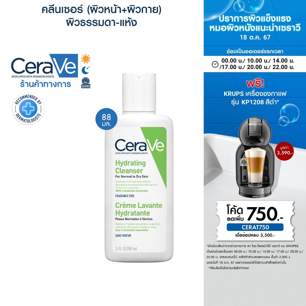 เซราวี CERAVE Hydrating Cleanser ทำความสะอาดผิวหน้าและผิวกาย สำหรับผิวแห้ง 88ml