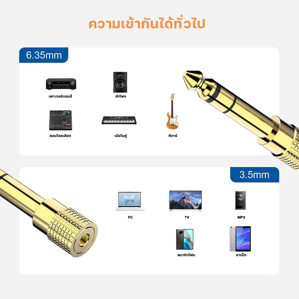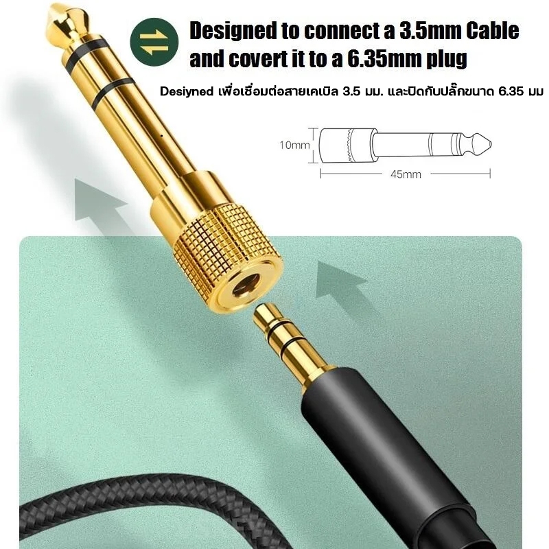 ... ง ประเภท: 3.5 มม. ชาย 6.5 มม. หญิง สี: ทอง จำนวน:1 ชิ้น ข้อมูลจำเพาะ: ชุบทอง แบบพกพา และทนทาน. แปลงสาย Audi ตัวผู้ 3.5 มม. เป็นตัวเมีย 6.5 มม แบบพกพาและขนาดเล็กใช้งานง่าย อายุการใช้งานยาวนาน สามารถใช้กับคอมพิวเตอร์ กล้อง ไมค์ การเชื่อมต่อเสียงมิกเซอร์ ในรายการรวมด้วย: 1 x 3.5 มม. ชายถึง 6.5 มม. อะแดปเตอร์เสียงหญิง 📣 รบกวนคุณลูกค้าอ่านรายละเอียดก่อนสั่งซื้อทุกครั้ง หากมีคำถามเพิ่มเติม สามารถทักแชทร้านได้เลยนะคะ 📣 สำคัญมาก‼️ หลังได้รับสินค้า กรุณาถ่ายรูปใบปะหน้า รูปพัสดุก่อนนแกะ และ ถ่ายวิดีโอขณะแกะสินค้าไว้เป็นหลักฐาน เพื่อใช้ในการเคลมด้วยนะคะ ‼️ 🚩🚩เงื่อนไขการรับประกัน🚩🚩 1. สินค้าชำรุด/ เสียหาย (จากผู้ผลิตเท่านั้น) 2. หากลูกค้าได้รับสินค้า ชำรุด หรืออุปกรณ์ไม่ครบ ให้ถ่ายรูปสินค้า แล้วส่งเข้าทางแชท เพื่อให้ทางร้านพิจารณา หากเป็นจริง ยินดีเปลี่ยนสินค้า หรือคืนเงิน แล้วแต่กรณีค่ะ 3. ถ้าลูกค้าได้รับสินค้าผิดแล้วยังแกะใช้งานหรือประกอบ ทางร้านจะไม่รับสินค้าคืนค่ะ 4.กรณีส่งสินค้าคืนร้าน กรุณาส่งคืนภายใน 3 วันหลังจากที่ตกลงกับทางร้านเรียบร้อยแล้ว หากเกินระยะเวลา ทางร้านจะไม่รับเคลมสินค้าค่ะ 5.ในกรณีที่ออร์เดอร์มีปัญหาอย่าพึ่งกดรับสินค้า เพราะหากลูกค้ากดยืนยันรับสินค้าในระบบแล้ว ทางร้านจะไม่รับผิดชอบใดๆทั้งสิ้นค่ะ เพราะจะไม่สามารถคืนสินค้าได้นะคะ และจะทำให้ไม่สามารถคืนเงินได้นะคะ *ลูกค้าจะต้องเก็บกล่องสินค้าและอุปกรณ์ไว้หากมีกรณีการคืนสินค้า **ร้านไม่รับผิดชอบต่อการใช้งานที่ผิดประเภท ไม่ว่ากรณีใดทั้งสิ้น 🙏🏻ขอขอบคุณที่ให้ความสนใจสินค้าของร้าน sและอย่าลืมแวะมาอุดหนุนกันอีกนะคะ 🙏🏻