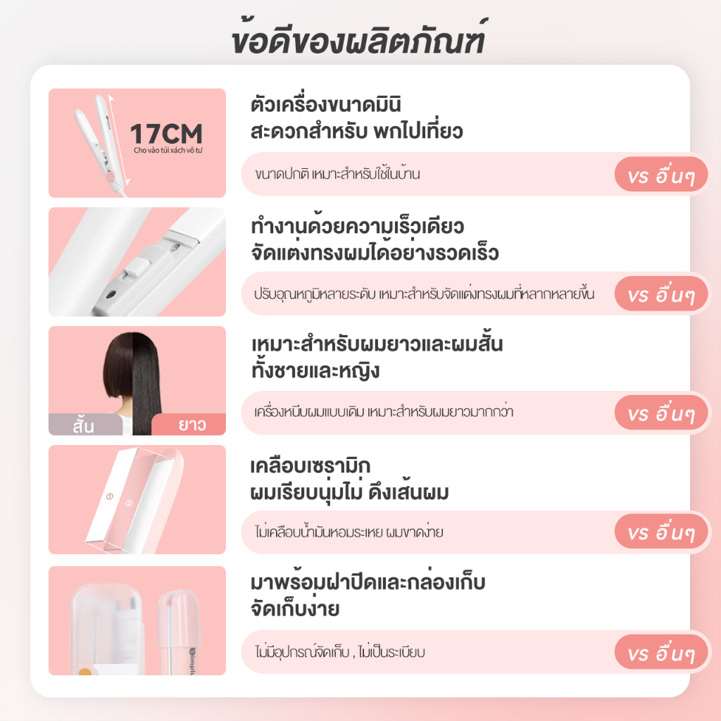 รูปทรงมินิ , น้ำหนักเบา , ใส่ในกระเป๋าได้ (ยาวเพียง 17 ซม.) มาพร้อมฝาครอบกันฝุ่นและกล่องเก็บ , เพื่อให้จัดเก็บได้ง่าย ร้อนเร็วภายใน 10 วินาที , จัดแต่งทรงผมได้รวดเร็ว พลังงาน 17 วัตต์ , มีประสิทธิภาพและประหยัดพลังงาน เคลือบเซรามิกไม่ทำร้ายเส้นผม ดีไซน์ทรงผมหลากหลายสไตล์: ผมหน้าม้า , ม้วนผม , ลอ