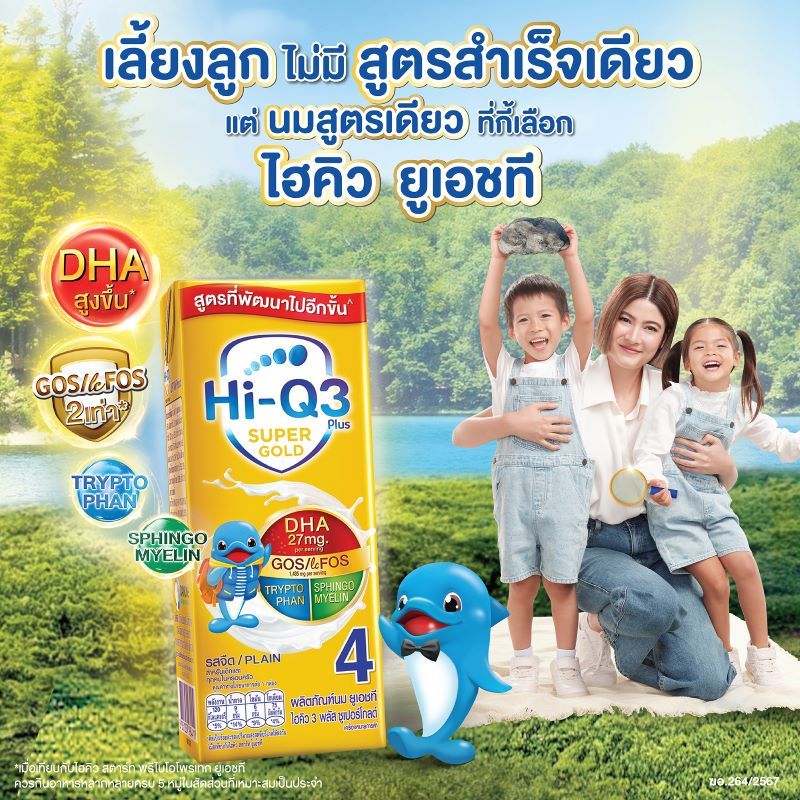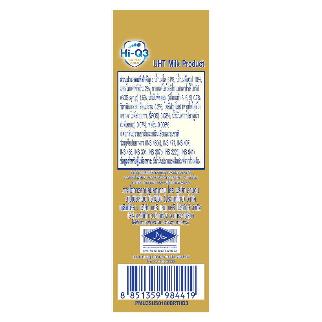 ไฮคิว 3 พลัส ซูเปอร์โกลด์ พรีไบโอ โพรเทก (สูตร4) ยูเอชที 180 มล. (108 กล่อง) สำหรับเด็กและทุกคนในครอบครัว Hi-Q 3 Plus UHT for Kids ส่วนประกอบที่สําคัญ : น้้ำนมโค 51%, นมผงขาดมันเนย 2.64%, มอลโทเดกซ์ทริน 2.31%, แลคโตโอลิโกแซกคา ไรด์ไซรัป (GOS syrup) 1.62%, น้ํามันพืช (น้ํามันคาโนลา, น้ํามันดอกทานต