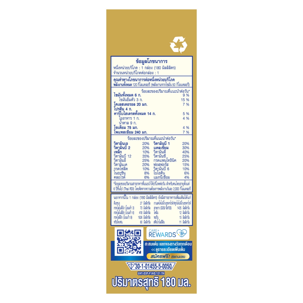 ... ะวัน) 0.7%, ไขมันนมปราศจากน้ํา 0.69% แลคโตส 0.5%, เกลือแร่ 0.19%, โพลีฟรุกโตส (ฟรุกโตโอลิโก แซกคาไรด์สายยาว, (FOS) 0.08%, น้ํามันจากปลาทูน่า (มีดีเอชเอ) 0.0698%, วิตามิน 0.04%, ทอรีน 0.01% สารท่าให้คงตัว (INS 46001), INS 471, INS 407, INS 466), สารป้องกันการเกิดออกซิเดชัน (INS 304, INS 307b), อิมัลซิไฟเออร์ (INS 322 (i)),แต่งกลิ่นธรรมชาติ ข้อมูลสําหรับผู้แพ้อาหาร: มีน้ํามันปลาและผลิตภัณฑ์จากถั่วเหลือง โภชนาการ พลังงานทั้งหมด 130 กิโลแคลอรี น้ำตาล 9 กรัม ไขมัน 6 กรัม โซเดียม 96 มิลลิกรัม หมายเลขอย.: 27-1-05543-5-0035 อายุการเก็บรักษา 8 เดือน นับจากวันที่ผลิต
