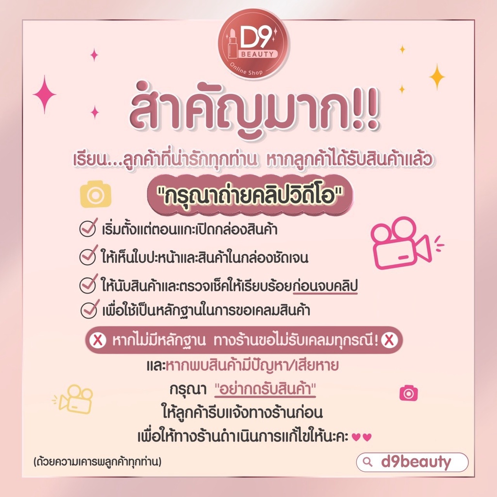 ... ิตามินอี (Tocopheryl Acetate): ป้องกันการทำลายของอนุมูลอิสระที่เกิดจากรังสียูวี Madecassoside: บรรเทาความแดง, อาการคัน และการอักเสบของ ใบว่านหางจระเข้: ช่วยป้องกันริ้วรอยและรอยเหี่ยวย่นในอนาคต ให้ความชุ่มชื่นแก่ผิวและบรรเทาการระคายเคือง ผสมด้วยสารสกัดจากกระบองเพชร prickly pear, สารสกัด guarana, สารสกัดจากแตงกวา และมาดคาสโซไซด์เพื่อให้ความชุ่มชื้นและบำรุง ผิวที่ระคายเคืองจากแสงแดดสงบ และฟื้นฟูสุขภาพผิวโดยรวม วิธีใช้ : ทาก่อนออกแดด 30นาที สามารถใช้ได้ทั้งใบหน้าและลำตัว (แนะนำทาทุกๆ 2 ชั่วโมงกรณีเจอแดดจัดๆนานๆ) ปริมาณสุทธิ: 200 มล. ------------------------------------------------------------------------------------------------------- ♥️ ขอบพระคุณลูกค้าที่ไว้วางใจ ร้าน D9Beauty นะคะ ♥️ ⏰ ทำการทุกวัน (เวลา 9.30 น. - 18.30 น.) ☺️ คำถามพบบ่อย☺️ ► มีสินค้าไหม/พร้อมส่งไหม → กดสั่งได้เลย สินค้าทุกชิ้นพร้อมส่งค่ะ / หากหมดทางร้านจะรีบแจ้งให้ลูกค้าทราบทันทีค่ะ ► ส่งสินค้าวันไหน → หลังจากได้รับออเดอร์ สินค้าจะถูกส่งออกจากร้านภายใน 1-3 วัน ทำการค่ะ ► ได้รับสินค้าวันไหน → หลังจากส่งออกจากร้าน ลูกค้าจะได้รับสินค้าภายใน 2-5 วันทำการค่ะ (ขึ้นอยู่กับขนส่งพื้นที่นั้นๆ) ► ส่งสินค้าทุกวันไหม → ส่งทุกวันค่ะ (หยุดวันนักขัตฤกษ์) ► ใช้บริการขนส่งเจ้าไหน → ตอนนี้ทางร้านใช้บริการ J&T Express ค่ะ ► ติดปัญหาเรื่องแก้ไขที่อยู่ / แก้ไขคำสั่งซื้อ / มีปัญหาเกี่ยวกับคำสั่งซื้อ → ติดต่อ Call center โทร 02-017-8399 ________________________________________________________