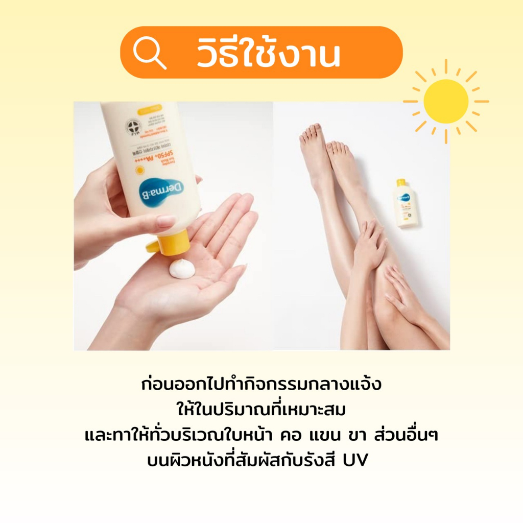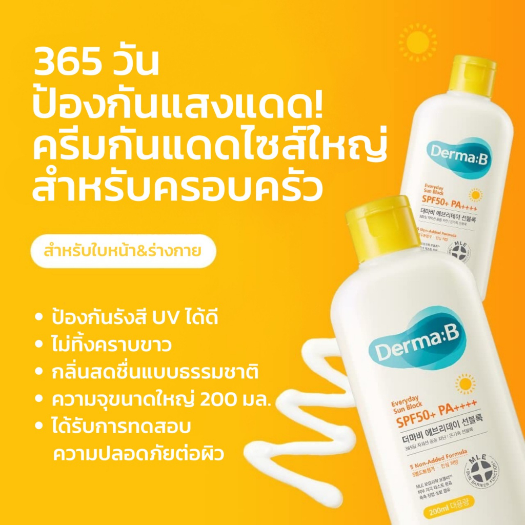 Derma:B Everyday Sun Block SPF50+ PA+++ 200ml ครีมกันแดดเนื้อบางเบาให้การปกป้องในวงกว้างสเปกตรัม SPF50+ PA++++ ในสูตรที่ไม่ก่อให้เกิดภูมิแพ้ที่เหมาะสำหรับทุกคนในครอบครัว สามารถใช้ได้กับใบหน้าและลำตัว ที่สำคัญ ปราศจากพาราเบน น้ำมันแร่ สีสังเคราะห์ เอทานอล และฟีนอกซีเอทานอล 🌟ส่วนผสมหลัก🌟 ว
