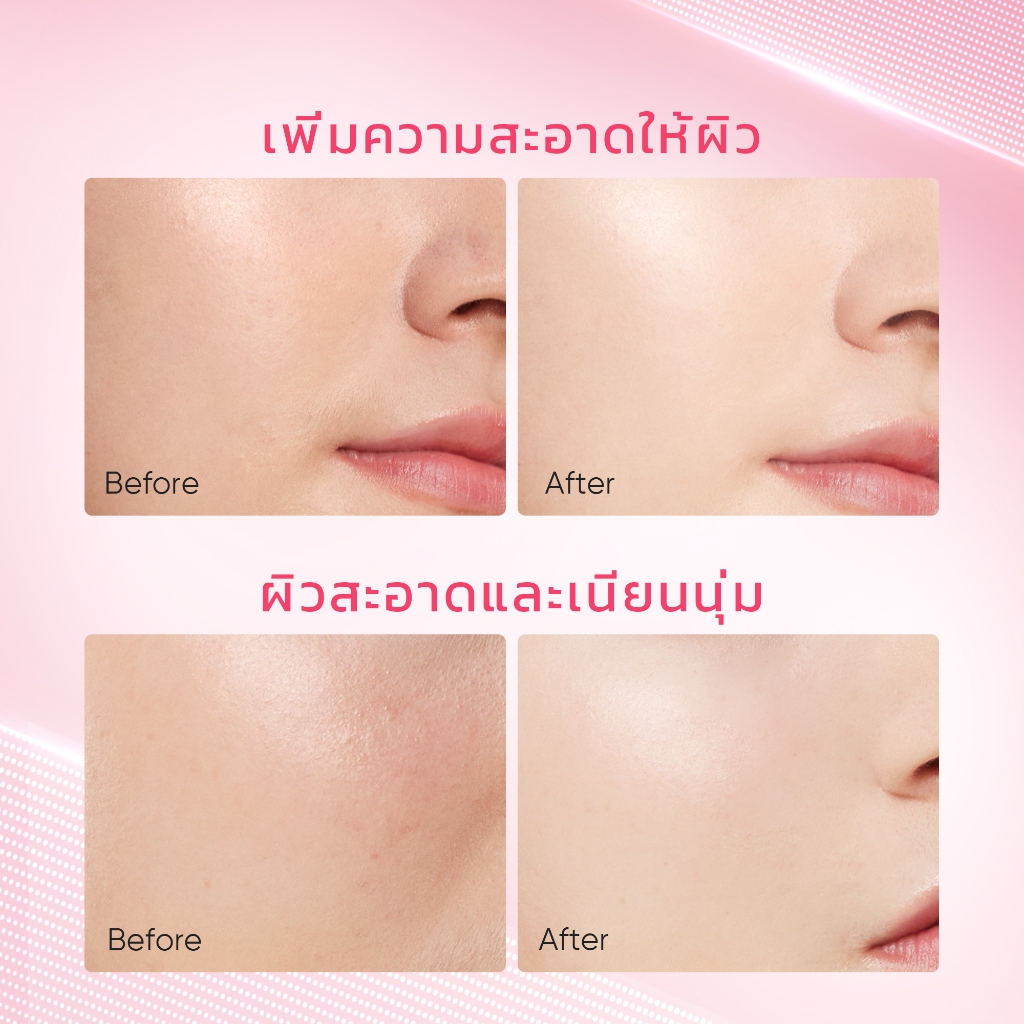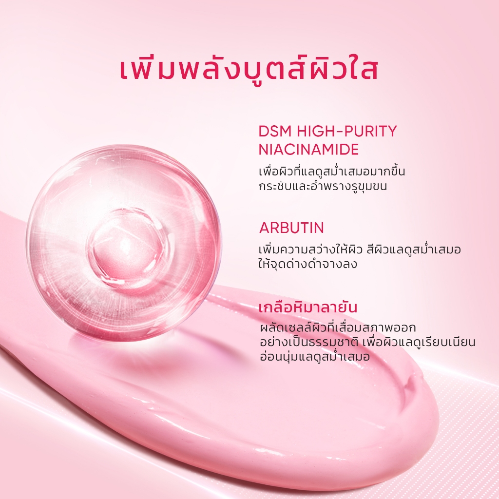 ... เกลือหิมาลายันและกรดทรานเอกซามิก (Tranexamic Acid) ที่ช่วยเพิ่มผิวใสแลดูสม่ำเสมอ เมื่อใช้ร่วมกับผลิตภัณฑ์ที่ช่วยเพิ่มความสดใสและคืนความสม่ำเสมอให้ผิว ปริมาณ: 40 กรัม จุดขาย: เพิ่มความสม่ำเสมอและความเปล่งประกายให้ผิว ทำความสะอาดสิ่งสกปรกตกค้าง ส่วนผสมหลัก: Niacinamide PC: เพิ่มความสม่ำเสมอให้ผิวและอำพรางรูขุมขนให้แลดูเล็กลง Pink Sea:ผลัดเซลล์ผิวที่เสื่อสภาพแล้วอย่างเป็นธรรมชาติเพื่อผิวใส เนียนนุ่ม แลดูสม่ำเสมอมากยิ่งขึ้น Arbutin :เพิ่มความสม่ำเสมอให้ผิวด้วยส่วนผสมจากธรรมชาติ ให้สีผิวแลดูสม่ำเสมอและรอยดำแลดูจางลง Tranexamic Acid : เพิ่มความสว่างให้ผิวและรอยดำแลดูจางลงโดยยับยั้งการผลิตเมลานิน วิธีใช้: ทำความสะอาดทั่วทั้งใบหน้า เปิดฝาข้างล่างออกและหมุนเกลียวบริเวณด้านล่างเพื่อให้ได้เนื้อมาสก์ในปริมาณที่เหมาะสม ทามาสก์ให้ทั่วทั้งใบหน้า ทิ้งไว้ 10 - 15 นาที ล้างออกด้วยน้ำเปล่า ใช้2-3 คร้งต่อสัปดาห์เพื่อประสิทธิภาพสูงสุด สำหรับผิวบอบบางแพ้ง่ายให้ทิ้งไว้เป็นเวลา 5นาที ก่อนจะทาให้ทั่วทั้งใบหน้าและเพิ่มเวลาเป็น 15 นาที >===============================