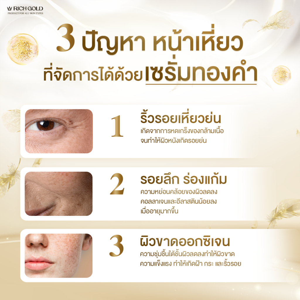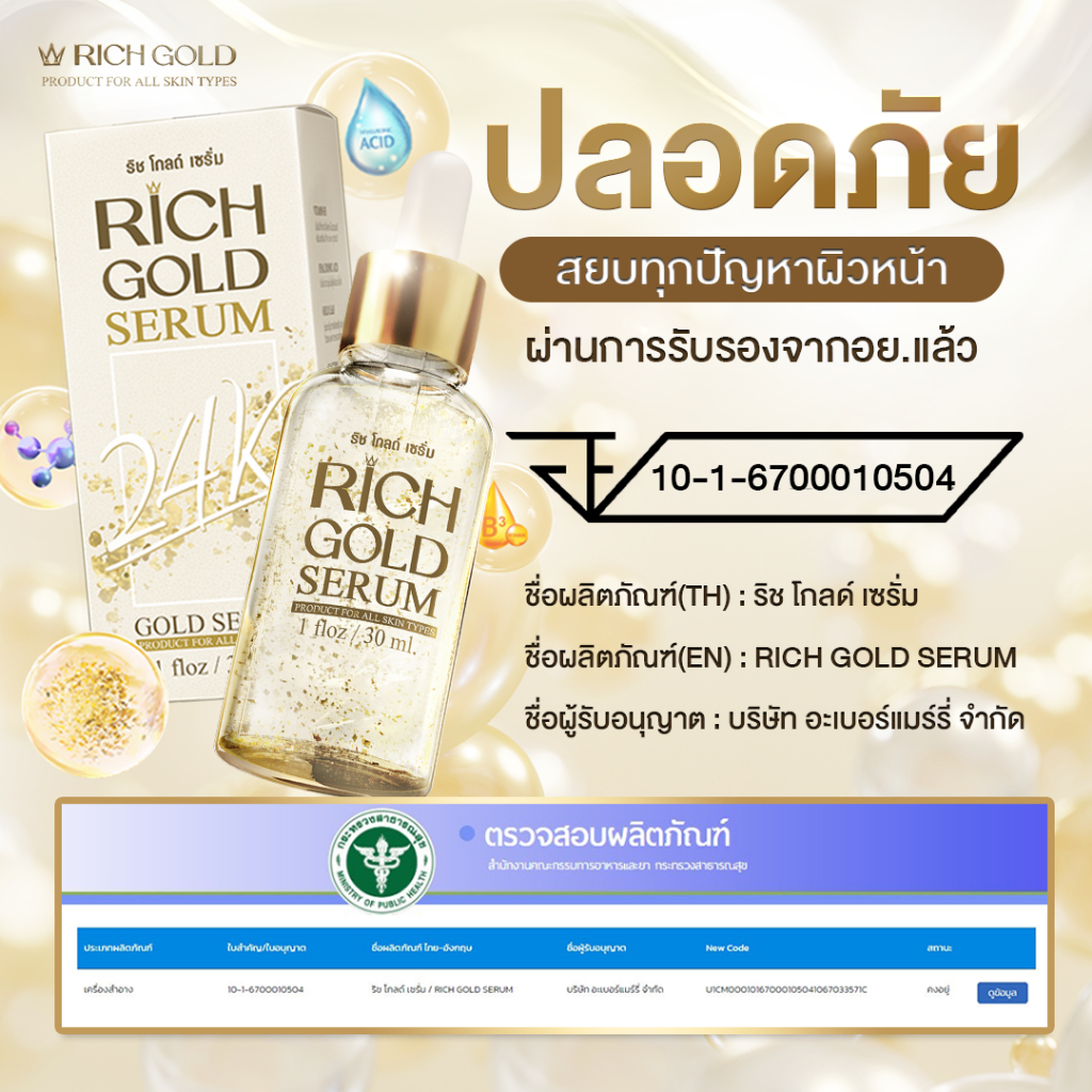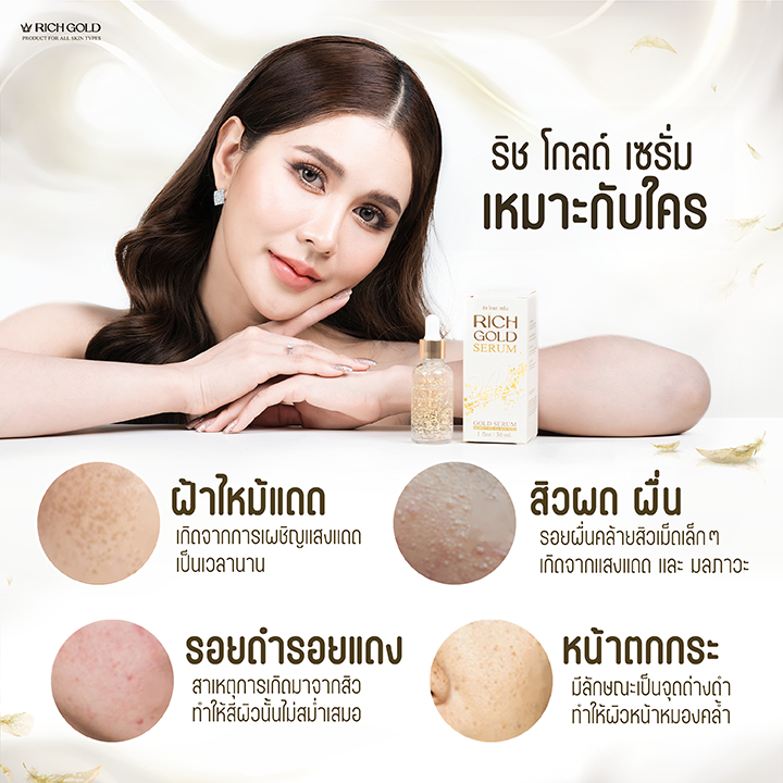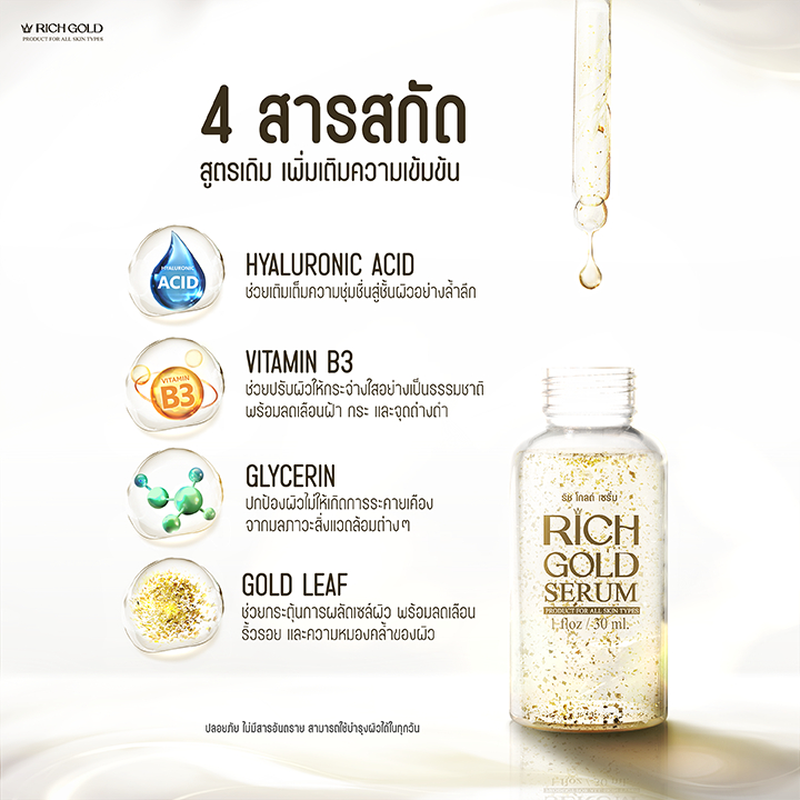 ริช โกลด์ เซรั่ม โฉมใหม่ บำรุงครบ จบในขวดเดียว (1 ขวด 30มล. ทาเช้า/เย็น ได้ขวดละเดือน) เซรั่มเนื้อบางเบา ผสมทองคำแท้24K ช่วยลดเลือนจุดด่างดำ ให้ความชุ่มชื้น เพื่อผิวฟู เด้ง อิ่มน้ำ เปล่งปลั่ง ดูกระจ่างใสอย่างเป็นธรรมชาติ ผสาน4สารสกัดเข้มข้น ช่วยลดเลือนจุดด่างดำ รอยสิว รอยดำรอยแดง และสีผิวไม่สม่ำ