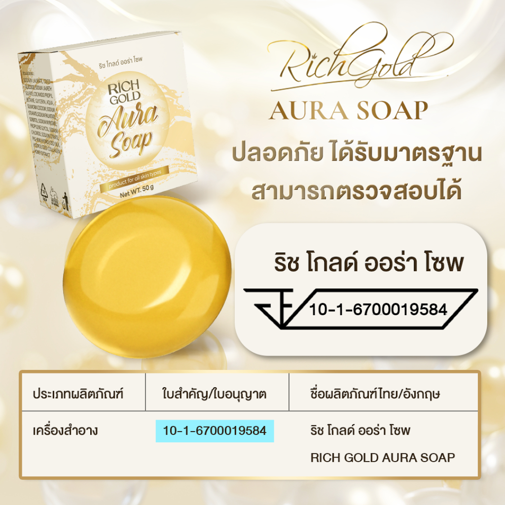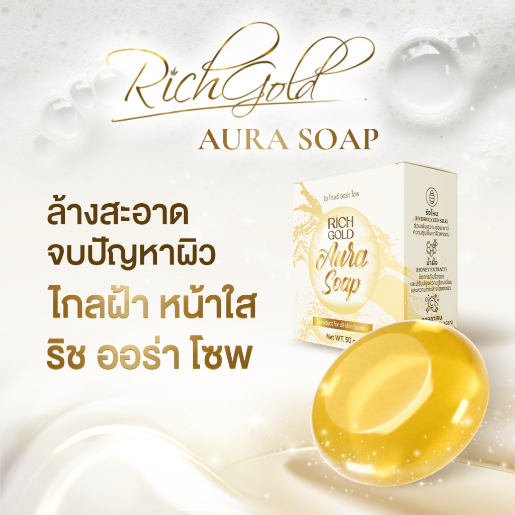 ... เสมอ วิธีใช้: ทาทั่วใบหน้าแล้วลำคอ เป็นประจำทุกวันหลังล้างหน้าในตอนเช้าและก่อนนอน คำเตือน 1.อ่านวิธีใช้ให้ละเอียดและปฏิบัติตามอย่างเคร่งครัด 2.หากใช้แล้วมีความผิดปกติใดๆเกิดขึ้น ต้องหยุดใช้และปรึกษาแพทย์หรือเภสัชกร 3.ผลลัพธ์ขึ้นอยู่กับแต่ละสภาพผิวแต่ละบุคคล ------------------ Rich Gold Aura Soap ริชโกลด์ ออร่า โซพ สบู่ทำความสะอาดผิวหน้าที่มีคุณสมบัติ ผิวมีความนุ่มชุ่มชื้น แลดูกระจ่างใส ผิวแข็งแรง รวม 3 สารสกัดที่คัดมาแล้วว่าดี ใช้ได้ทั้งผิวหน้าและลำคอ เหมาะกับทุกสภาพผิว แม้ผิวแพ้ง่าย - รังไหม (HYDROLYZED SILK) ช่วยเรื่องริ้วรอย แลดูให้ผิวคงความอ่อนเยาว์ เติมความชุ่มชื้นแก่ผิวพรรณ - น้ำผึ้ง (HONEY EXTRACT) ช่วยชะลอวัย ปรับปรุงความเรียบเนียน ความกระจ่างใสของผิว - คอลลาเจน (HYDROLYZED COLLAGEN) ช่วยดูแลผิวให้ดูสดใส เปล่งปลั่ง ห่างไกลฝ้ากระ จุดด่างดำ และรอยจากสิว ผสานเข้ากันอย่างลงตัว ปลอดภัย ไม่มีสารอันตราย ใช้ทำความสะอาดผิวหน้าได้ทุกวัน วิธีใช้ 1. ถูสบู่ที่เปียกน้ำจนเกิดฟอง 2. ลูบไล้ให้ทั่วผิวหน้าและลำคอ 3. ล้างออกด้วยน้ำสะอาด คำแนะนำ : เก็บสบู่ไว้ในที่แห้ง ที่อุณหภูมิห้องปกติ หลีกเลี่ยงความร้อน แสงแดด และไม่วางปะปนกับสบู่ชนิดอื่น ข้อควรปฏิบัติ : อ่านวิธีใช้ให้ละเอียดและปฏิบัติตามอย่างเคร่งครัด หากใช้แล้วมีความผิดปกติใดๆเกิดขึ้น ต้องหยุดใช้ และปรึกษาแพทย์หรือเภสัชกร