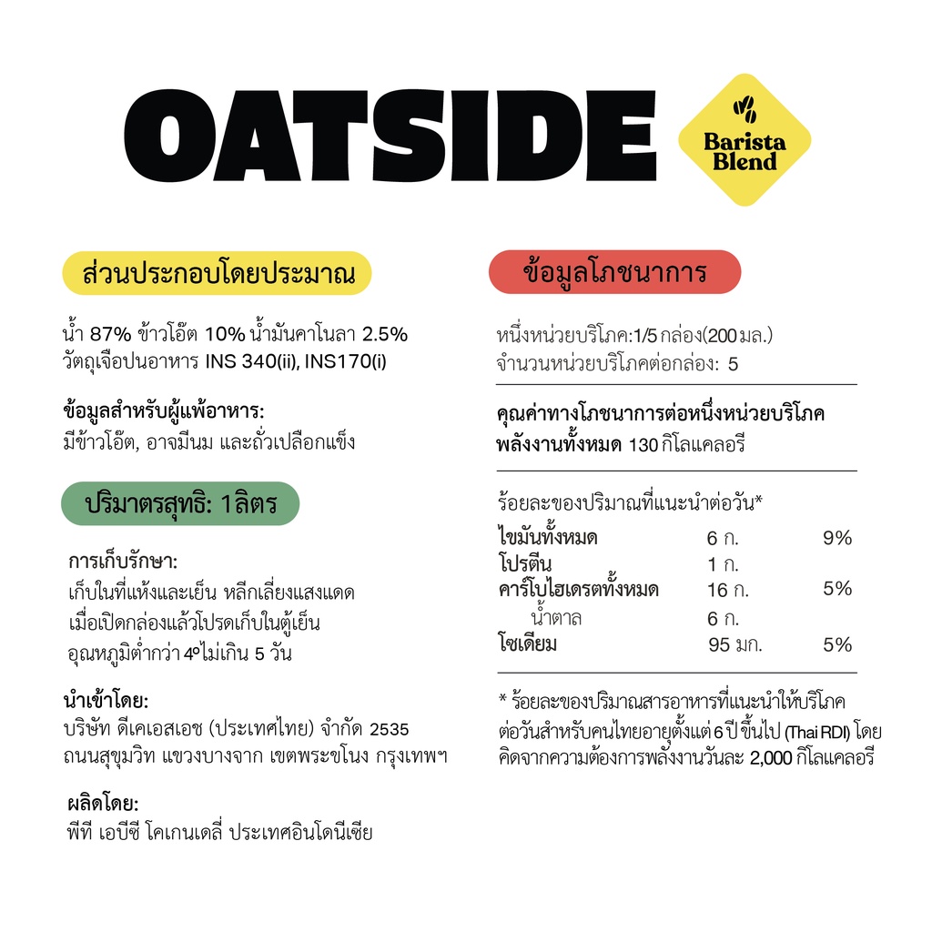 ... าวโอ๊ตคั่ว - ไม่มีวัตถุกันเสีย - เหมาะสำหรับคนทานเจ Vegan หรือ มังสวิรัติ - ไม่มี Lactose ย่อยง่าย สบายท้อง - ไม่มีสารก่อให้เกิดภูมิแพ้ เหมาะสำหรับทุกเพศ ทุกวัย: เด็ก ผู้ใหญ่ และผู้สูงอายุ - แหล่งของแคลเซียม และ ไฟเบอร์ - เบต้ากลูแคน: มีคุณสมบัติในการช่วยเสริมสร้างภูมิคุ้มกันให้กับร่างกาย - ไม่มีคอเลสเตอรอล *เขย่าก่อนดื่ม และยิ่งแช่เย็นยิ่งอร่อย *เก็บในที่แห้งและเย็น หลีกเลี่ยงแสงแดด *เมื่อเปิดกล่องแล้ว โปรดเก็บในตู้เย็นอุณหภูมิต่ำกว่า 4 องศาเซลเซียส และ บริโภคให้หมดภายใน 5 วัน"