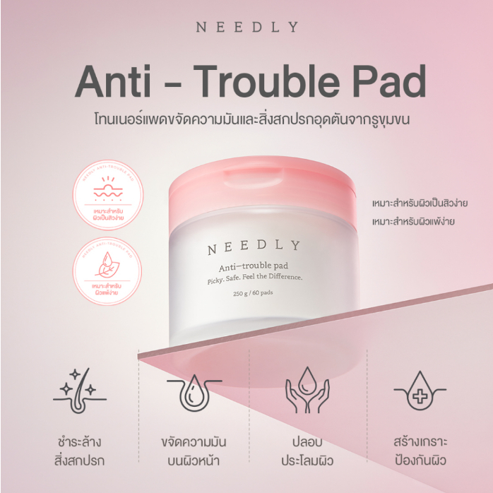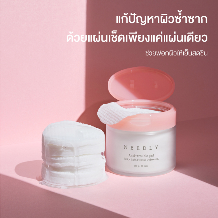 Needly-Anti Trouble Pad 250g. (60แผ่น) โทนเนอร์แพดลดการเกิดสิว พร้อมขจัดความมันและสิ่งสกปรกอุดตันจากรูขุนขน มี AHA และ PHA ช่วยผลัดเซลล์ผิวอย่างอ่อนโยน พร้อม BHA และ LHA ลดต้นเหตุของการเกิดสิว เหมาะสำหรับผิวที่เป็นสิวง่าย และผิวบอบบางแพ้ง่าย