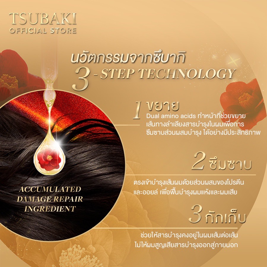 ... ม คอนดิชันเนอร์ รีแพร์ แชมพู ครีมนวด ขวดสีแดง สำหรับผมธรรมดาถึงแห้ง Tsubaki Premium Moist Shampoo ซึบากิ แชมพู พรีเมี่ยม มอยส์ Tsubaki Premium Moist Conditioner ซึบากิ พรีเมี่ยม คอนดิชันเนอร์ มอยส์ เพื่อผมกลับดูสุขภาพดี ฟื้นบำรุงผมเสียให้กลับดูสุขภาพดีอีกครั้งด้วยการดูแลที่ล้ำลึก*ถึงภายใน ด้วยนวัตกรรมใหม่ล่าสุดจากซึบากิ ที่ช่วยซึมซาบสารบำรุงเข้าสู่เส้นผมได้อย่างล้ำลึก* โดยใช้เทคโนโลยีเดียวกันกับการทำทรีทเมนท์ที่ซาลอน พร้อมมอบความหอมแบบ Fruity floral ที่ผสานระหว่างความหอมอย่างมีระดับจากมวลดอกไม้นานาชนิด และความหอมสดชื่นแบบฟรุตตี้ได้อย่างลงตัว *หนังศีรษะชั้นนอก 1 ซึมซาบ นวัตกรรมใหม่ล่าสุดจากซึบากิที่ช่วยขยายเส้นทางลำเลียงสารบำรุงในเส้นผม (CMC) เพื่อให้สารบำรุงสามารถซึมซาบสู่เส้นผมได้ง่ายและล้ำลึกกว่าที่เคย 2บำรุง ช่วยคุมระดับการซึมซาบสารบำรุงให้เหมาะกับสภาพเส้นผมที่แตกต่างจึงมอบความรู้สึกที่เบาสบายศีรษะเหมาะกับผมธรรมดาไปจนถึงผมที่ต้องการการฟื้นบำรุงเป็นพิเศษพร้อมด้วยส่วนผสมที่คัดสรรมาเพื่อช่วยบำรุงให้ผมกลับดูสุขภาพดี 3กักเก็บ ช่วยกักเก็บสารบำรุงไว้ในผมเส้นต่อเส้นเพื่อผมดูสวยสุขภาพดีจนรู้สึกได้ถึงความเปลี่ยนแปลง ############################## TSUBAKI ซึบากิ พรีเมียม รีแพร์ มาส์ก 180 กรัม มาสก์ผม กระปุกทอง มาส์กบำรุงเส้นผม (ชนิดล้างออก) ด้วยคุณค่าจากคามิเลียออยล์, โปรตีนไข่มุก และรอยัล เจลลี่ ผสานนวัตกรรมที่ช่วยซึมซาบสารบำรุงเข้าสู่เส้นผมได้อย่างล้ำลึก พร้อมกักเก็บสารบำรุงในผมเส้นต่อเส้น จึงช่วยบำรุงให้ผมดูสวยสุขภาพดี ดุจได้รับการปรนนิบัติจากซาลอน วิธีใช้ - หลังสระผมด้วยแชมพู ชโลมมาส์กช่วงกลางถึงปลายผมที่เปียกหมาด - ทิ้งไว้ประมาณ 5 นาที แล้วล้างออกด้วยน้ำสะอาด - ควรใช้สัปดาห์ละ1 ครั้ง เพื่อการฟื้นบำรุงเส้นผมอย่างล้ำลึก ############################## TSUBAKI ซึบากิ พรีเมียม รีแพร์ มาส์ก 180 ก. (Spring Edition) มาสก์ผม กระปุกชมพู ใหม่ Spring Camellia Hair Mask มอบความหอมดั่งฤดูใบไม้ผลิในญี่ปุ่นด้วย "Pink Camellia" มาส์กบำรุงเส้นผม (ชนิดล้างออก) ด้วยคุณค่าจากคามิเลียออยล์, โปรตีนไข่มุก และรอยัล เจลลี่ ผสานนวัตกรรมที่ช่วยซึมซาบสารบำรุงเข้าสู่เส้นผมได้อย่างล้ำลึก พร้อมกักเก็บสารบำรุงในผมเส้นต่อเส้น จึงช่วยบำรุงให้ผมดูสวยสุขภาพดี ดุจได้รับการปรนนิบัติจากซาลอน วิธีใช้ - หลังสระผมด้วยแชมพูชโลมมาส์กช่วงกลางถึงปลายผมที่เปียกหมาด แล้วล้างออกได้ทันทีโดยไม่ต้องรอ - ควรใช้สัปดาห์ละ 1-2 ครั้ง เพื่อการฟื้นบำรุงเส้นผมอย่างล้ำลึก