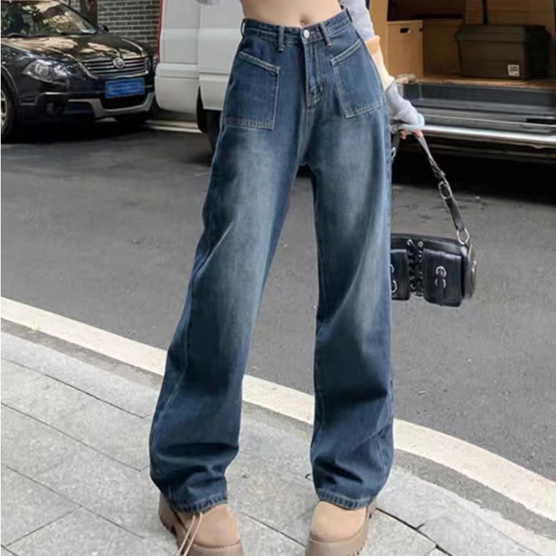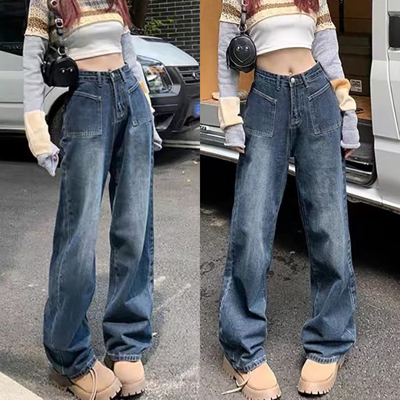 กางเกงยีนส์ขายาวเอวสูง กางเกงยีนส์ขายาวทรงทรงกระบอก แฟร์ชั่น สไตล์เกาหลี