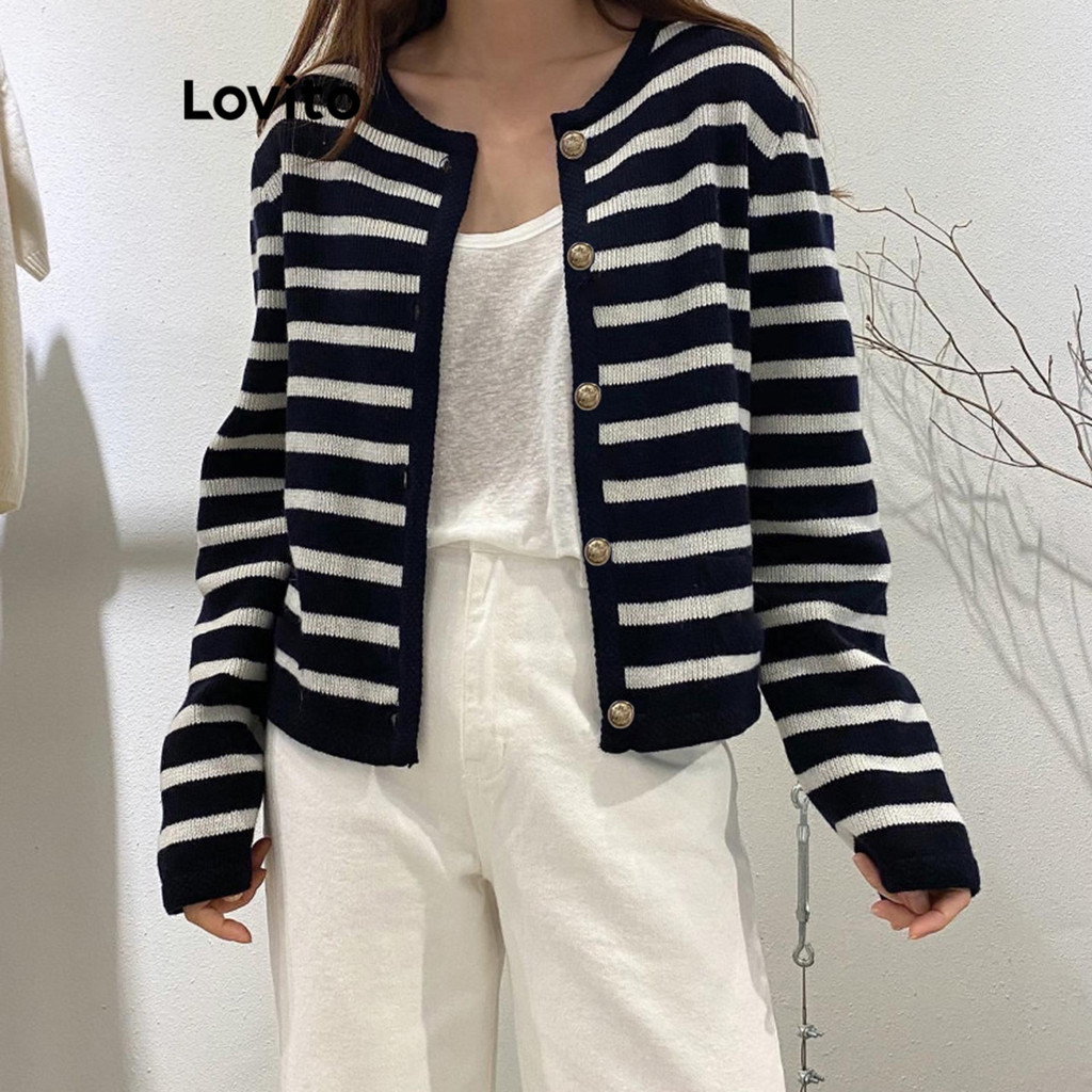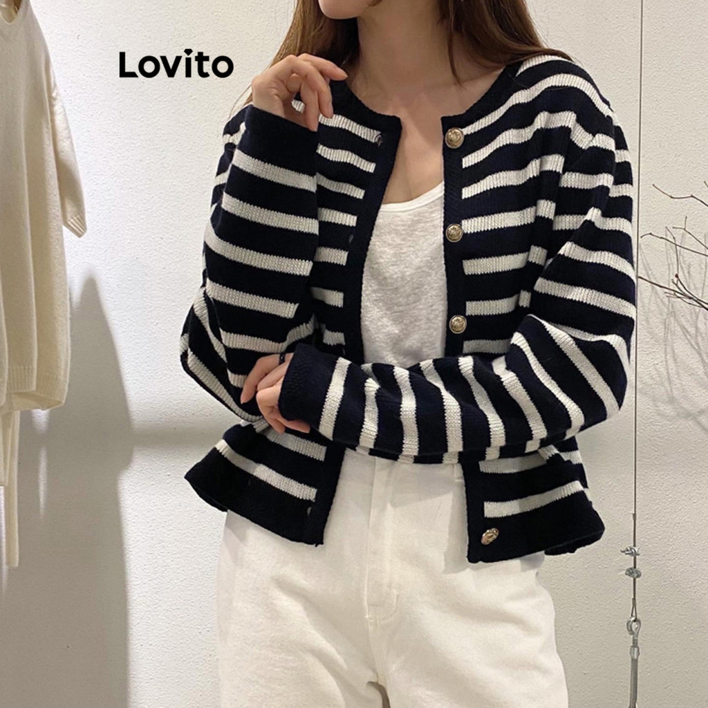 Lovito เสื้อคาร์ดิแกนผู้หญิง กระดุมหน้าแบบโลหะ ลายทาง สไตล์ลำลอง LNE36135 (หลากสี)