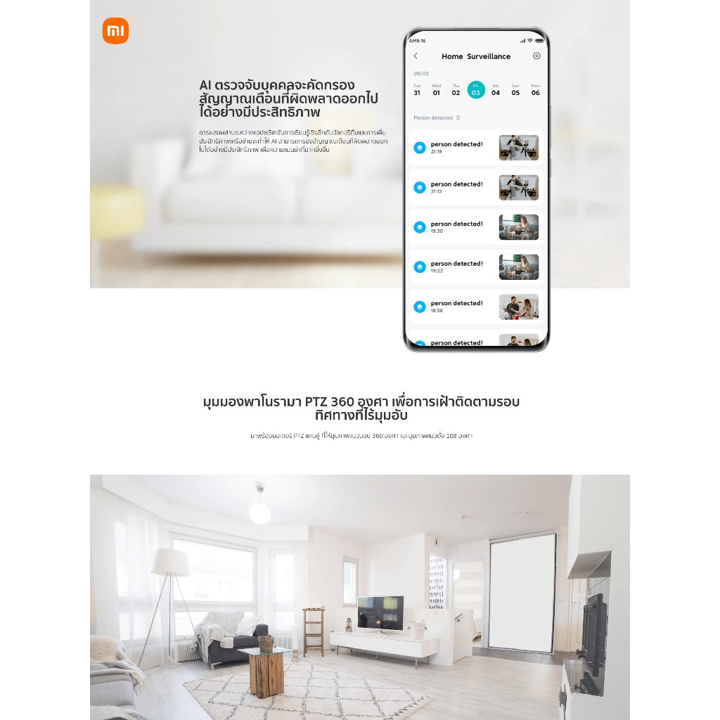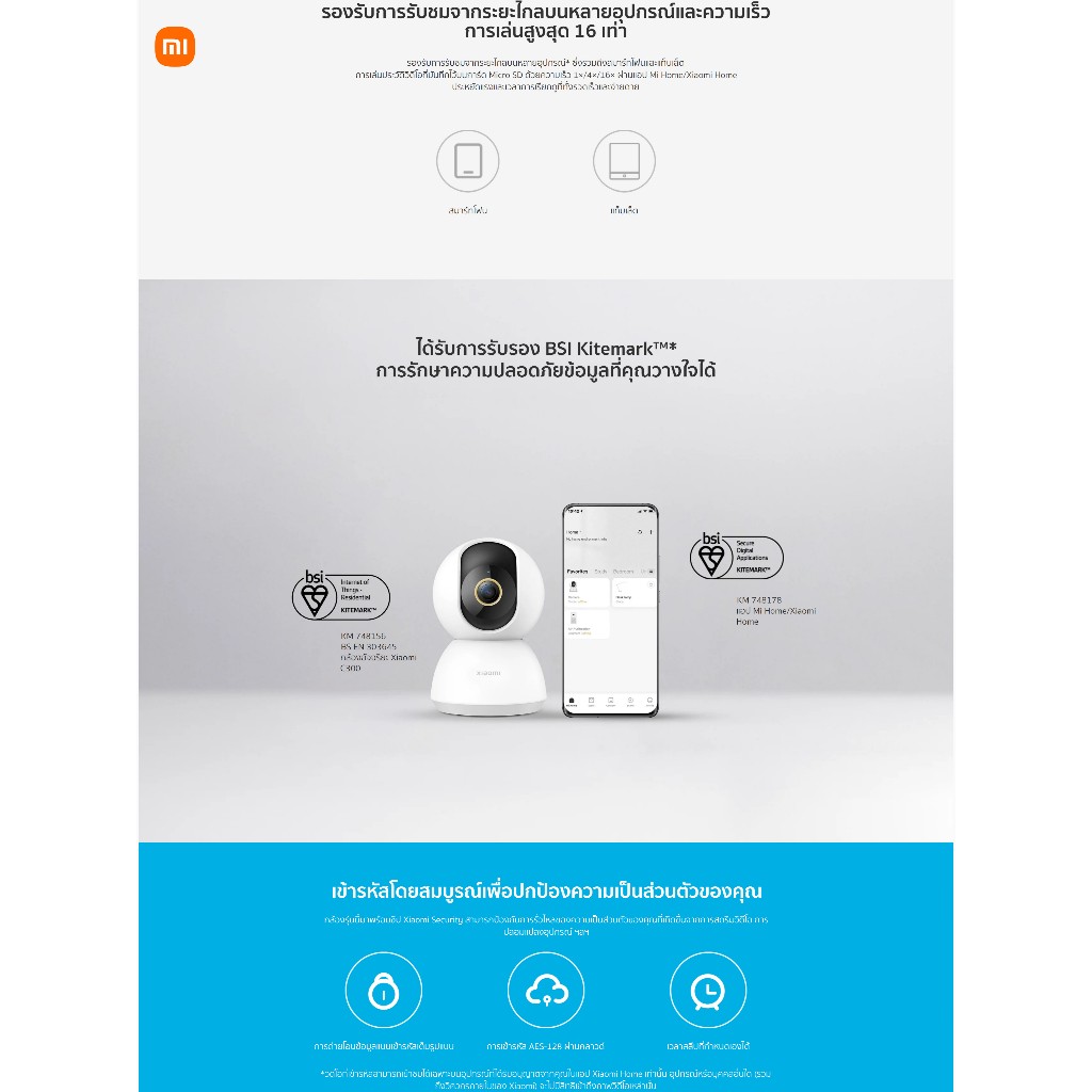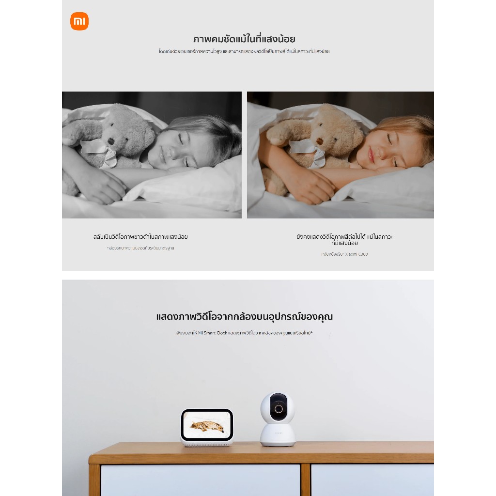 ... งแกน พร้อมมุมมองแนวนอน 360° และมุมมองแนวตั้ง 106° ⭐️ 1080P Full HD เพื่อคุณภาพวิดีโอที่ชัดเจนยิ่งขึ้น 2.0 เมกะพิกเซลและ WDR แม้แต่ภาพย้อนแสงก็ยังชัดเจนและมีรายละเอียด ⭐️ การมองเห็นในตอนกลางคืนโดยไม่มีแสงสีแดงที่มองเห็นได้เพื่อการเฝ้าติดตามที่ชัดเจนและปลอดภัยยิ่งขึ้น นอนหลับสบายโดยไม่มีแสงสีแดงที่มองเห็นได้ในเวลากลางคืน และไม่มีมลภาวะทางสายตา แสงอินฟราเรด 940nm เพื่อภาพในเวลากลางคืนที่ชัดเจนยิ่งขึ้น ⭐️ การตรวจจับมนุษย์ด้วย AI สำหรับการติดตามและบันทึกอัตโนมัติ ฟังก์ชันการติดตามบุคคลถูกปิดใช้งานโดยค่าเริ่มต้น และสามารถเปิดใช้งานผ่านแอป ⭐️ การโทรด้วยเสียงสองทางหมายถึงการโทรแบบเรียลไทม์สองทางไปยัง ผ่านแอพ คุณสมบัติ: ✅ ชื่อผลิตภัณฑ์: Xiaomi Smart Camera C200 1080P ✅ Wi-Fi IEEE 802.11 b/g/n 2.4GHz ✅ กำลังไฟ : 5V/2A ✅ อุณหภูมิในการทำงาน::-10℃~40℃ ✅ พื้นที่จัดเก็บ:การ์ด microSD (สูงสุด 256 GB) ✅ แอพรองรับ Android 4.4 และ iOS 9.0 ขึ้นไป ✅ ทำงานร่วมกับ MiHome + Alexa + Google APP ✅ ขนาด 108 * 75* 75mm ✅ น้ำหนัก:225 กรัม ✅ มาตรฐานสินค้า:Q31/0115000198C009-2018 รายการของภายในกล่อง: 📦 Xiaomi Smart Camera C200×1 📦 คู่มือผู้ใช้×1 📦 สายไฟ×1(ไม่มีอะแดปเตอร์) 📦 ชุดอุปกรณ์เสริมสำหรับติดตั้งบนผนัง×1 --------------------------- 📷 Xiaomi Smart Camera C301 2K รายละเอียดสินค้า: ⭐️ ชิปความปลอดภัย MJA1 การปกป้องความปลอดภัยระดับเดียวกับที่ใช้ในด้านการเงิน ⭐️ ความคมชัดที่ 3MP และความละเอียดที่ 2304x1296 ทำให้กล้องสามาถแสดงภาพได้ที่ระดับ 2K เพื่อให้คุณมองเห็นรายละเอียดเล็กๆ ⭐️ รูรับแสงขนาดใหญ่และเลนส์ 4P ส่งมอบภาพที่มีชัดเจนสว่างไสวยิ่งขึ้น ⭐️ การสนทนาเสียงสองทางแบบเรียลไทม์ สื่อสารกับครอบครัวได้จากระยะไกล ⭐️ การตรวจจับบุคคลและสัญญาณเตือนต่อเนื่อง ⭐️ ทำงานได้กับ Amazon Alexa หรือ Google Assistant ข้อมูลจำเพาะ: ✅ชื่อ:กล้องอัจฉริยะ Xiaomi C301 ✅อินพุตพิกัด:5V⎓1A ✅ขนาดเครื่อง:78 × 76 × 115 มม. ✅ความละเอียด:2304 × 1296 ✅โคเดกของวิดีโอ:H.265 ✅อุณหภูมิในการทำงาน:-10°C~45°C ✅การเชื่อมต่อไร้สาย:Wi-Fi IEEE 802.11b/g/n 2.4GHz ✅เข้ากันได้กับ:Android 8.0 และ iOS 12.0 ขึ้นไป ✅พื้นที่จัดเก็บ:การ์ด microSD (รองรับ 8 GB–256 GB)/พื้นที่จัดเก็บแบบคลาวด์ 📦ภายในกล่อง: 📦กล้องอัจฉริยะ Xiaomi C301 📦สายชาร์จ 📦คู่มือผู้ใช้ 📦สกรูและฐาน (ประกอบด้วยสกรู × 2, ปลั๊กติดผนัง × 2) 📦ประกาศการรับประกัน 📦สติกเกอร์เทมเพลตสำหรับติดตั้ง --------------------------- 📷 Xiaomi Smart Camera C300 2K รายละเอียดสินค้า: ⭐️ 2K ultra-clear HD* อัพเกรดคุณภาพของภาพอย่างเต็มที่คมชัดทุกเฟรม,ภาพคมชัดแม้ในที่แสงน้อย ⭐️ ความละเอียด HD มาตรฐาน: 1920 × 1080=1080p (2 เมกะพิกเซล); ความละเอียด HD ที่คมชัดเป็นพิเศษที่ได้รับการอัปเกรด: 2304 × 1296=1296p (3 เมกะพิกเซล) ⭐️ อัพเกรดเลนส์ 6P เพื่อการแสดงผลที่มีคุณภาพสูงขึ้น เลนส์ที่ได้รับการอัพเกรดอย่างเต็มที่ช่วย