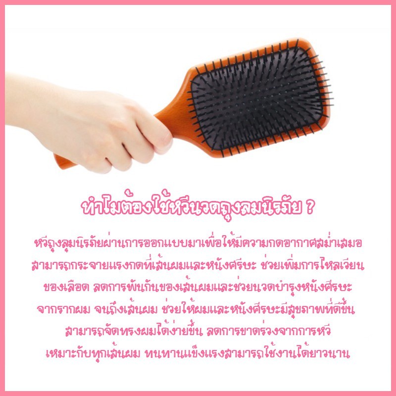 คุณสมบัติ -แปรงไม้หวีผม แปรงสำหรับการดูแลรักษาเส้นผม ลดการขาดร่วงจากการหวี -ลดการพันกันของเส้นผมและ ช่วยนวดบำรุงหนังศีรษะจากรากผม จนถึงเส้นผม -ช่วยให้ผมและหนังศีรษะมีสุขภาพที่ดีขึ้น สามารถจัดทรงผมง่ายกว่าเดิม -ตัวหวีแต่ละซี่ของแปรงจะช่วยกระตุ้นและนวดหนังศีรษะไปในตัว ช่วยลดความเครียดของเส้นผมและห