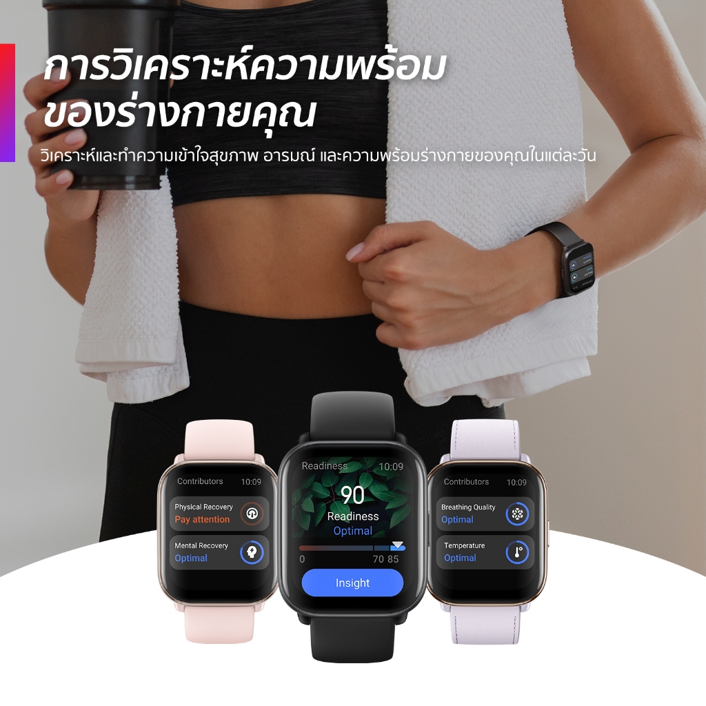 ... ีสีให้เลือก (Colors) Puple, Pink, Black, Gold 3. สายนาฬิกา - ประเภทสาย สายหนัง, สายซิลิโคน ระบบเซ็นเซอร์ - เซ็นเซอร์วัดหัวใจแบบออปติคอล (Optical Heart Rate Sensor) - ตรวจจับการเคลื่อนไหว (Accelerometer) - ตรวจจับคลื่นแม่เหล็กไฟฟ้า (Electromagnetic Wave Sensor) คุณสมบัติการติดตาม - การนับก้าว (Step counter) - ติดตามการนอน (Sleep monitoring) - เป้าหมายกิจกรรม (Auto goal) - คำนวณแคลอรี่ (Calories burned) - ระยะเดินทาง (Distance traveled) คุณสมบัติพิเศษ - การแจ้งเตือน (Notifications) - รับสายโทรศัพท์ (Answer the phone) - ลำโพง (Speaker) - ไมโครโฟน (Microphone) - ออกกำลังกาย (GymKit) - ควบคุมเพลง (Control music) - มี GPS (GPS) - ประมาณค่าออกซิเจนในเลือด (Oxygen Saturation) - ติดตามความเครียด (All-day Stress) - กันน้ำ 5ATM (Water resistant) คุณสมบัติด้านออกกำลังกาย - การวิ่ง (Running) - ว่ายน้ำ (Swim) - โยคะ (Yoga) - ปั่นจักรยาน (Cycle) - ปีนเขา (Climbing) - การเดิน (Walking) - บาสเกตบอล (ฺBasketball) - ฟุตบอล (Soccer) - แบดมินตัน (Badminton) - ฟิตเนส (Fitness) - แอโรบิค (Aerobic) - กระโดดเชือก (Skipping rope) - ไตรกีฬา (Triathlon) - สกี (Ski) - พายเรือ (ฺBoating) - เทเบิลเทนนิส (Table Tennis) - สเก็ตบอร์ด (Skateboard) - เซิร์ฟ (Server) - สตรีทแดนซ์ (Street dance) - เดินป่า (Hiking) - เทนนิส (Tennis) - วอลเลย์บอล (Volleyball) - เบสบอล (Baseball)