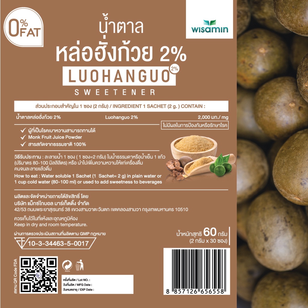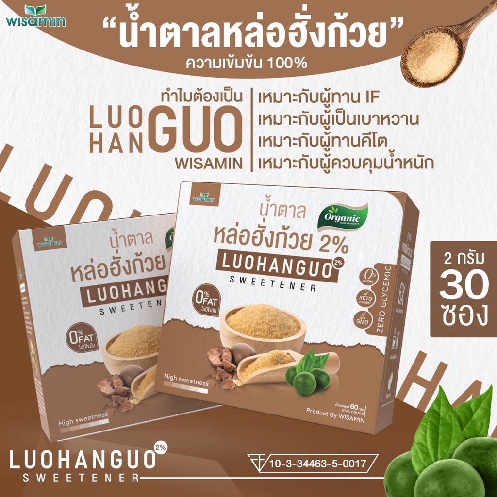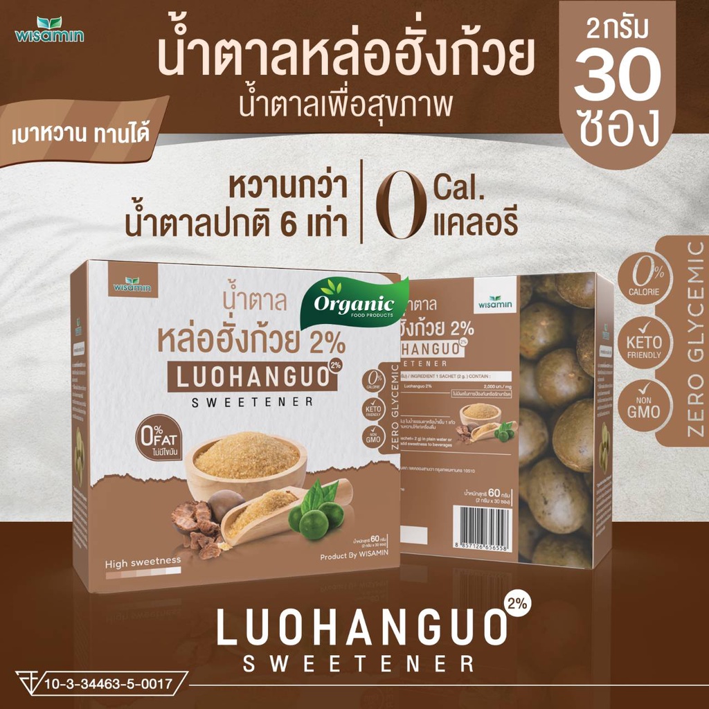... เท่านั้น 🚨 หากได้รับสินค้าไม่ครบ กรุณาส่งคลิปวีดีโอ ยืนยันทางเเชท 🚨 หากไม่มีคลิปยืนยัน ร้านขออนุญาตไม่รับผิดชอบทุกกรณี 🚨🚨ย้ำคลิปวีดีโอเท่านั้น🚨🚨 🙏🏻🙏🏻 ขอบพระคุณลูกค้าทุกท่านที่อุดหนุนค่ะ 🙏🏻🙏🏻 ------------------------------------------------ ✅ WISAMIN หล่อฮั่งก้วย (Luohanguo 2%) - น้ำตาลสุขภาพ 0 แคลอรี่ , ไม่กระตุ้นอินซูลินในกระแสเลือด - ใช้เติมในเครื่องดื่มที่ชื่นชอบได้ทุกชนิด - ใช้ประกอบอาหาร ได้ทั้งคาวและหวาน - น้ำตาลทางเลือก สำหรับผู้ป่วยเบาหวาน กลุ่มผู้ทานคีโต - มีความหวาน 6 เท่าของน้ำตาล ------------------------------------------------ ✅ WISAMIN น้ำตาลหล่อฮั่งก้วย (Luohanguo 2%) - บรรจุ 30 ซอง/กล่อง - ปริมาณ 2 กรัม /ซอง (2 g / Sachet) ------------------------------------------------ - แบรนด์ : wisamin (วิษามิน) - เลขจดทะเบียน อย. : 10-3-34463-5-0017 - อายุเก็บรักษา : 2 ปี นับจากวันผลิต ------------------------------------------------ ✅ ส่วนประกอบที่สำคัญ หล่อฮั่งก้วย 2% Luohanguo 2% / Monkfruit 2% ------------------------------------------------ ✅ น้ำตาลหล่อฮั่งก้วย แบรนด์ WISAMIN - ได้ผ่านการทดสอบ Sensory ประสาทสัมผัสรสชาติว่ามีความหวานใกล้เคียงน้ำตาลมากที่สุดและให้รสหวานที่พอดี ในขนาดรับประทานต่อ 1 ซอง ------------------------------------------------ ✅ WISAMIN น้ำตาลหล่อฮั่งก้วย ความเข้มข้น 100% มีความหวานเท่ากับน้ำตาล 300 เท่า น้ำตาลหล่อฮั่งก้วย แบรนด์ WISAMIN ใช้ความเข้มข้น 2% โดยให้ความหวาน 6 เท่าของน้ำตาลทรายปกติ *** ที่ไม่ใช้ความเข้มข้น 100% เพราะเราไม่สามารถรับประทานได้ เนื่องจากความเข้มข้น 100% จะหวานที่ขมมากเกินไป *** ------------------------------------------------ ✅ Organic Monk Fruit Extract 2% Mogroside V โมโกรไซด์ (Mogroside) ซึ่งมีความหวานกว่าน้ำตาลประมาณ 300 เท่า จึงนิยมนำมาเป็นสารเพิ่มความหวานในอาหารและเครื่องดื่มที่มีรสหวานในอุตสาหกรรมอาหาร ซึ่งได้รับการยอมรับจากสำนักงานคณะกรรมการอาหารและยา ของสหรัฐอเมริกา(USFDA) ว่าสามารถใช้เป็นสารให้ความหวานได้อย่างปลอดภัย และยังไม่มีผลกระทบต่อระดับอินซูลินในกระแสเลือด ------------------------------------------------ ✅ คุณสมบัติของหล่อฮังก้วย หล่อฮังก้วยเมื่อนำมาสกัดจะให้สารที่ให้ความหวานแทนน้ำตาลชื่อว่า "โมโกรไซด์ (Mogrosides)" เป็นสารที่อยู่ในกลุ่มไกลโคไซด์ ซึ่ง (Triterpene Glycosides) เป็นสารที่ให้ความหวานแทนน้ำตาลประมาณ 250-300 เท่า แต่ไม่ให้พลังงาน ดังนั้นจึงไม่ส่งผลต่อระดับน้ำตาลในเลือด (อินซูลิน) ของผู้ป่วย โดยแพทย์จะอนุญาตให้ผู้ป่วยโรคเบาหวานสามารถดื่มเครื่องดื่มที่มีรสหวานได้ แต่เครื่องดื่มต้องไม่มีน้ำตาลเป็นส่วนประกอบสำคัญอยู่ภายใน และหล่อฮังก้วยยังได้รับการยอมรับจากสำนักงานคณะกรรมการอาหารและยา ของสหรัฐอเมริกา (USFDA) ว่าสามารถใช้เป็นสารให้ความหวานได้อย่างปลอดภัย ------------------------------------------------ ✅ สรรพคุณของหล่อฮั่งก้วย - บรรเทาอาการแพ้ - ช่วยลดความเสี่ยงโร