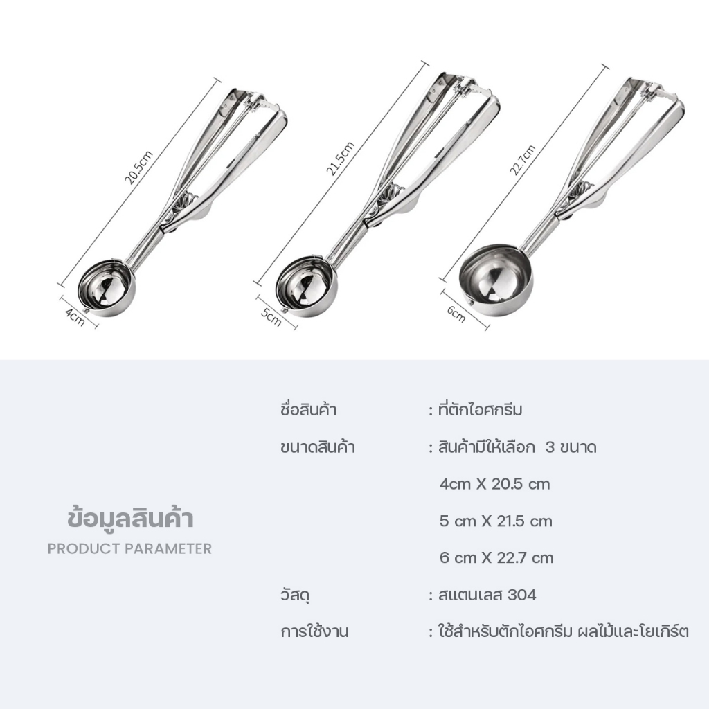 ชื่อสินค้า : ที่ตักไอศกรีม ขนาดสินค้า : สินค้ามีให้เลือก 3 ขนาด 4cm X 20.5 cm 5 cm X 21.5 cm 6 cm X 22.7 cm วัสดุ : สแตนเลส 304 การใช้งาน : ใช้สำหรับตักไอศกรีม ผลไม้และโยเกิร์ต -ปลอดภัย ไม่เป็นสนิม - ด้ามจับโค้งรับกับสรีระมือ จับถนัดมือกว่าเดิม - วัสดุปลอดภัย ไม่เป็นอันตราย มาพร้อมตัวช่ว