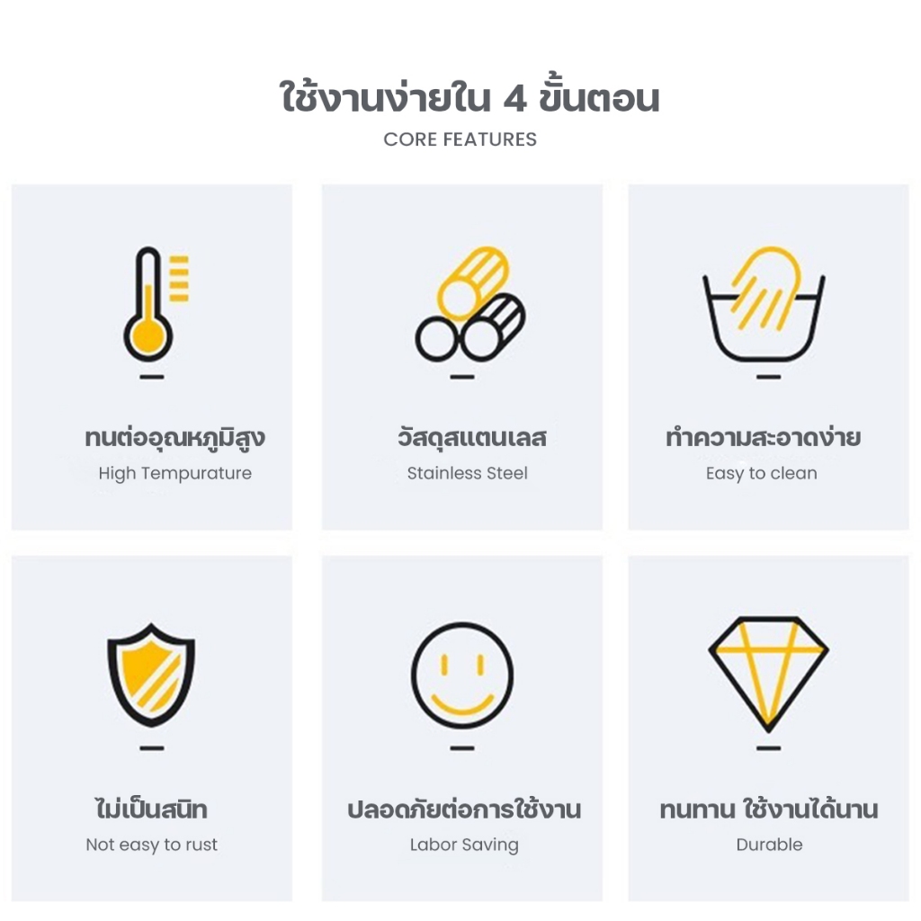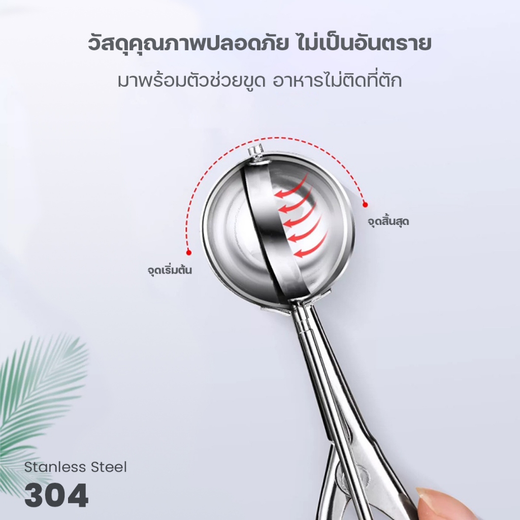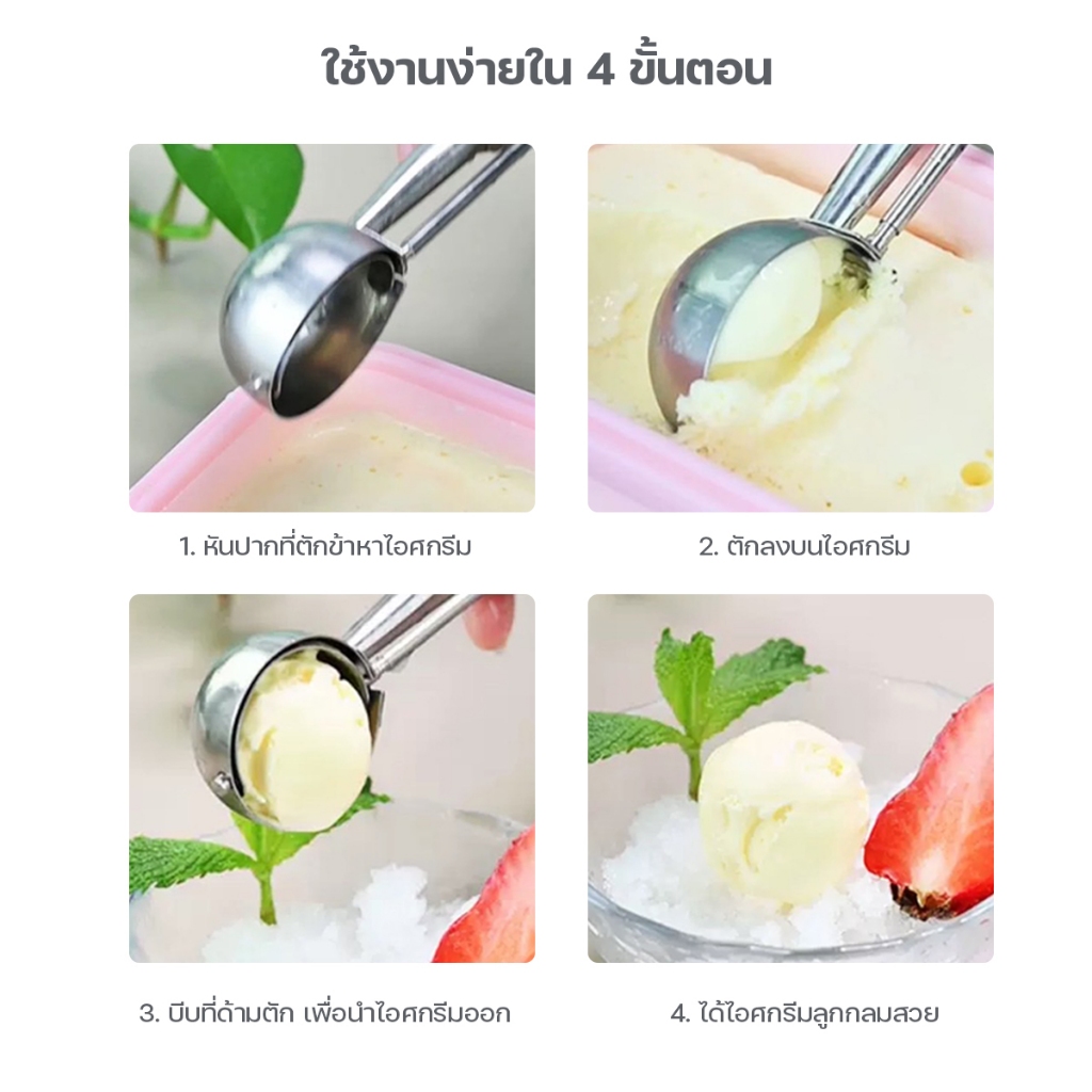 ... ยขูด อาหารไม่ติดที่ตัก - อัพเกรดใหม่ ทนทานกว่าเดิม วัสดุหนาขึ้น ใช้งานได้นานกว่าเดิม - ล้างทำความสะอาดง่าย ใช้งานง่ายใน 4 ขั้นตอน 1. หันปากที่ตักข้าหาไอศกรีม 2. ตักลงบนไอศกรีม 3. บีบที่ด้ามตัก เพื่อนำไอศกรีมออก 4. ได้ไอศกรีมลูกกลมสวย