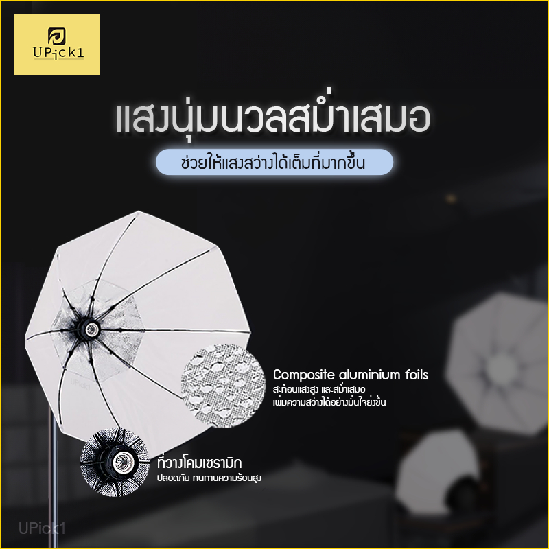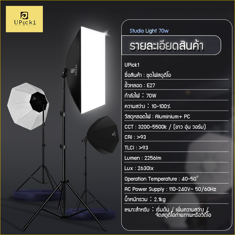 ... งไฟ Light Stand: 70-210cm (สามารถเลือกได้) (3.1) ขาตั้งไฟ Carbon Steel 2.1m (เหล็กกล้าคาร์บอน) ฟังก์ชั่นเสริม:สามารถเลือกได้ 1. (A)studioLight / Soft4(2ชุด)+ชุดขาตั้งเซลฟี่(C) 2. (B)studioLight / Soft8-ดำ(2ชุด)+ชุดขาตั้งเซลฟี่(C) 3. (C)studioLight / Soft8-ขาว(2ชุด)+ชุดขาตั้งเซลฟี่ (C) ขาตั้งเซลฟี่: 1. ขาตั้ง Carbon Steel 2.1m (คาร์บอน) 2. ข้อต่อปรับหมุน 360° 3. ที่จับมือถือหมุนล็อก (C) 4. รีโมทเซลฟี่ วิธีใช้งาน : 1. ประกอบอุปกรณ์เข้าด้วยกัน 2. จัดวางไฟในตำแหน่งที่ต้องการ 3. เปิดใช้งานอุปกรณ์ 4. เสร็จสิ้น คำเตือน: 1.ไม่ควรใช้ปลั๊กร่วมกับอุปกรณ์ไฟฟ้าเป็นจำนวนมาก 2. ไม่ควรใช้ในพื้นที่ที่อากาศร้อนสูง รายละเอียดสินค้า: UPick1 ชื่อสินค้า: ชุดไฟสตูดิโอ ขั้วหลอด: E27 กำลังไฟ:70W ความสว่าง:10-100% วัสดุหลอดไฟ : Aluminium+ PC CCT :3200-5500k / (ขาว อุ่น วอม) CRI : >93 TLCI : >93 Lumen: 2256lm Lux: 2630lx Operation Temperature : 40-50° AC Power Supply : 110-240V~ 50/60Hz ขนาดสินค้ารวม: 14*36*87cm น้ำหนักรวม:2.1kg เหมาะสำหรับ:เริ่มต้น / เพิ่มความสว่าง / จัดสตูดิโอถ่ายภาพหรือวีดีโอ *หมายเหตุ* หากต้องการให้ร้านออกใบกำกับภาษี/ใบเสร็จ/บิลเงินสด หรือสินค้ามีปัญหา รบกวนแจ้งมาที่ช่องแชทได้เลยครับ