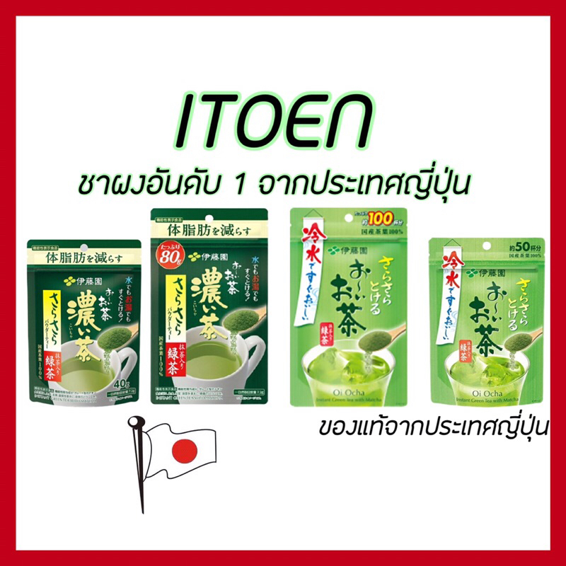 ... ขนม หรือ ของว่าง ก็อร่อย สามารถชงได้ทั้งในน้ำร้อนและน้ำเย็น ---------------------------------------------------------------- 👉ITOEN Instant Green Tea Matcha (ชาเขียวเข้มข้น ขนาด 40g / 80g) ชาเขียวผสมมันฉะที่เข้มข้นมากๆ ผสมผสานกับรสชาติที่กลมกล่อม ใช้ใบชาญี่ปุ่น 100% "ยูทากะมิโดริ" ที่มีคาเตชินจำนวนมาก บรรจุในถุงซิปล็อค ป้องกันความชื้น จัดเก็บได้ง่าย ดื่มพร้อมกับเค้ก ขนม หรือ ของว่าง ก็อร่อย สามารถชงได้ทั้งในน้ำร้อนและน้ำเย็น ส่วนผสม: ชา (ชาเขียว (ยูทากะสีเขียว) / มัทฉะ) เดกซ์ทรินวิตามินซี 👉Itoen Instant ocha green tea Roasted Green Tea 40g/80g(สีส้ม) วัถตถุดิบจาก ชา (โฮจิฉะ (บันฉะ/อิจิบันฉะ)) ชาคั่วสำเร็จรูปที่ทำจากส่วนผสมของใบชาชั้นหนึ่งที่มีกลิ่นหอม (ใบชาที่ผลิตในประเทศญี่ปุ่น 100%) คั่วอย่างพิถีพิถันบนไฟแบบเปิด โฮจิฉะที่มีกลิ่นหอมทำจากอิจิบันฉะที่มีรสหวานและมีกลิ่นหอม 👉Itoen Genmaicha 40 g ชาช้าวกล้องผสมมัทฉะ ชาข้าวกล้องสำเร็จรูปที่คุณสามารถเพลิดเพลินกับรสชาติธรรมชาติของการชงในกาน้ำชาได้อย่างง่ายดาย ละลายง่ายแม้ในน้ำเย็น และคุณสามารถเพลิดเพลินกับกลิ่นหอมนุ่มของข้าวกล้องได้ภายในเวลาเพียง 3 วินาที สัดส่วนการชง : ชา 1 ช้อน (0.8 กรัม) หรือมากกว่าตามความต้องการชงกับน้ำ 1 แก้ว สามารถละลายได้ทั้งน้ำร้อนและน้ำเย็น 👉Itoen Uji Matcha 30g ใช้มัทฉะบดหิน มัทฉะนี้มีสีเขียวสดใสและมีเนื้อสัมผัสที่น่าพึงพอใจ โดยใช้อุจิมัทฉะบดจากเกียวโต 100% ไม่เพียงแต่ใช้สำหรับชงชาเท่านั้น แต่ยังใช้สำหรับทำขนมหวานและอาหารอื่นๆ อีกด้วย