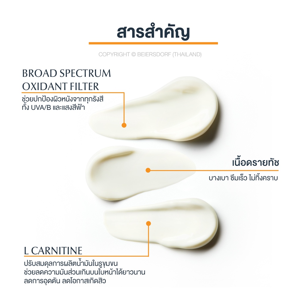 ... และ Broad-Spectrum Oxidant Filter ที่พิสูจน์แล้วปกป้องทุกรังสีทั้ง UVA/B พร้อมลดการทำร้ายผิว จากรังสี High Energy Visible Light 85% - ลดจุดด่างดำ ฝ้าแดดฝังลึก - ผสานคาร์นีทีนช่วยควบคุมความมันระหว่างวัน ได้ยาวนานถึง 12 ชม. - ช่วยลดโอกาสเกิดสิวอุดตัน ได้อย่างมีประสิทธิภาพ บทพิสูจน์โดยผู้เชี่ยวชาญทางด้านผิวพรรณ เนื้อดรายทัชบางเบา ควบคุมความมันนาน 12 ชั่วโมง ผ่านการทดสอบว่าไม่อุดตัน (Non-Acnegenic) ปราศจากน้ำหอม สี และพาราเบน ผ่านการทดสอบในผิวบอบบางแพ้ง่าย คำแนะนำการใช้ ลูบไล้เนื้อครีมเจลให้ซึมซาบสู่ผิวหน้าก่อนออกแดด และควรทาซ้ำเป็นประจำ ไม่ต้องเขย่าขวดก่อนใช้ ข้อควร และไม่ควรปฏิบัติ 1.การใช้ผลิตภัณฑ์เครื่องสำอางที่มีสารป้องกันแสงแดด เป็นเพียงวิธีหนึ่งที่จะช่วยลดความเสี่ยงจากอันตรายจากแสงแดด 2.อ่านวิธีใช้ให้ละเอียดและปฎิบัติตามอย่างเคร่งครัด 3.หากใช้แล้วมีความผิดปกติใด ๆ เกิดขึ้น ต้องหยุดใช้และปรึกษาแพทย์ 8850029028293 69674-07701-21 101221832