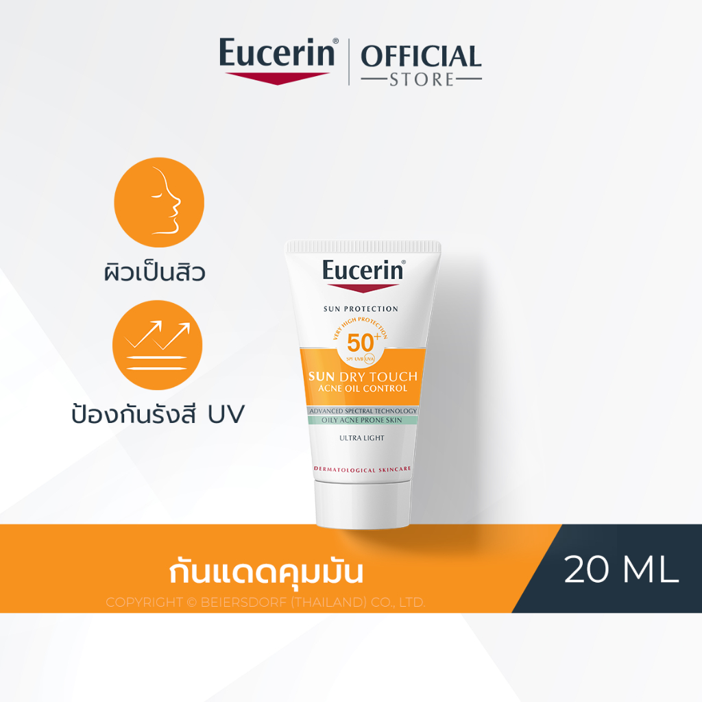 Eucerin SUN DRY TOUCH ACNE OIL CONTROL SPF50+ PA++++ 20 ML (ยูเซอริน ซัน ดราย ทัช ออยล์ คอนโทรล ครีมกันแดดเนื้อบางเบา สำหรับผิวหน้า SPF50+ 20มล) ผลิตภัณฑ์กันแดดสำหรับผิวหน้า ผิวเป็นสิว แพ้ง่าย ไวต่อแดด - กันแดดสูตรควบคุมความมันเพื่อผิวมันเป็นสิวง่าย - ผสาน 3 ค่าการปกป้องผิว ด้วย SPF50+ PA++++