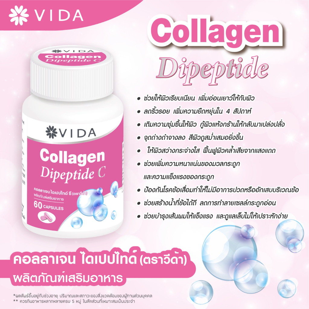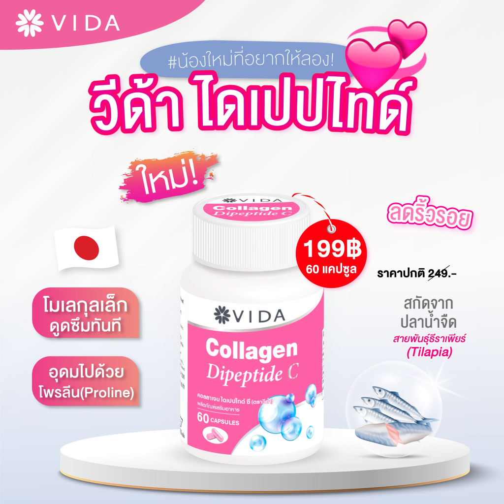 ... ✨ มีส่วนช่วยในเรื่อง 🟠 ช่วยเสริมสร้างการสร้างคอลลาเจนใต้ผิว 🟠 มีส่วนช่วยในการบำรุงผิว ช่วยลดสิวลดเลือนริ้วรอย 🟠 ซ่อมแซม และ ฟื้นฟูสภาพผิว ช่วยชะลอการเสื่อมสภาพของเซลล์ผิว 🟠 ช่วยสร้างเสริม และเพิ่มประสิทธิภาพในการทำงานของคอลลาเจน 🟠 อุดมไปด้วยสารต้านอนุมูลอิสระปกป้องผิวจากแสงแดด 🟠 เสริมสร้างภูมิคุ้มกัน ช่วยลดอาการหวัด ช่วยต้านการติดเชื้อแบคทีเรีย รวมไปถึงช่วยลดอาการแพ้ต่างๆ เช่น โรคภูมิแพ้ เป็นต้น ✨เหมาะกับผู้ที่ต้องการ 🌞เสริมสร้างภูมิคุ้มกันให้กับร่างกาย ป้องกันหวัด 🌞ปกป้องเซลล์จากอนุมูลอิสระ ต้านการอักเสบ และการบำรุงสายตา 🌞มีส่วนช่วยในการบำรุงผิว ให้ผิวกระจ่างใส ช่วยลดสิว ลดเลือนริ้วรอย 🌞ซ่อมแซม ฟื้นฟูสภาพผิว และช่วยชะลอการเสื่อมสภาพของเซลล์ผิว 🌞ช่วยสร้างเสริมและเพิ่มประสิทธิภาพในการทำงานของคอลลาเจน 🫙 1 ขวดบรรจุ 60 แคปซูล ✨ วิธีรับประทาน 👉 ทานบำรุงแบบปกติ : วันละ 1 แคปซูล (หลังอาหารเช้า) 👉 เสริมสร้างภูมิต้านทาน : วันละ 2 แคปซูล (หลังอาหารเช้า) 👉 ทานบำรุงแบบเร่งด่วน : เช้า 2 แคปซูล เย็น 2 แคปซูล (หลังอาหาร) ---------------------------------------------------------------------------------------------------------------------------------------------------------------------- 🌷Vida Collagen Dipeptide C🌷 (วีด้า คอลลาเจน ไดเปปไทด์ ซี) 🦄 ภายใน 1 แคปซูลอัดแน่นไปด้วยคอลลาเจน ไดเปปไทด์ เกรดพรีเมียมจากประเทศญี่ปุ่น ที่มาจากสารสกัดจากปลาน้ำจืด สายพันธ์ธีราเพียร์ อุดมไปด้วยโพรลีน ไฮดรอกซีโพรลีน กระตุ้นการสร้างคอลลาเจน อีลาสติน และไฮยาลูโรนิกแอซิค โมเลกุล ขนาดเล็กสุด ดูดซึมไปใช้ได้อย่างรวดเร็ว ✨ มีส่วนช่วยในเรื่อง 💟 ช่วยให้ผิวเรียบเนียน เพิ่มความอ่อนเยาว์ให้กับผิว 💟 ลดริ้วรอย เพิ่มความยืดหยุ่นใน 4 สัปดาห์ 💟 เติมความชุ่มชื้นให้ผิว กู้ผิวแห้งกร้านให้กลับมาเปล่งปลั่ง 💟 จุดด่างดำจางลง สีผิวดูสม่ำเสมอยิ่งขึ้น 💟 ให้ผิวสว่างกระจ่างใส พื้นฟูผิวคล้ำเสียจากแสงแดด 💟 ช่วยเพิ่มความหนาแน่นของมวลกระดูก และความแข็งแรงของกระดูก 💟 ป้องกันโรคข้อเสื่อมทำให้ไม่มีอาการปวดหรืออักเสบบริเวณข้อ 💟 ช่วยสร้างน้ำที่ข้อได้ดี ลดการทำลายเซลล์กระดูกอ่อน 💟 ช่วยบำรุงเส้นผมให้แข็งแรง และดูแลเล็บไม่ให้เปราะหักง่าย 🫙 1 ขวดบรรจุ 60 แคปซูล ✨ วิธีรับประทาน 👉 ทานบำรุงแบบปกติ : วันละ 1 แคปซูล (ก่อนนอน หรือก่อนอาหารเช้า) 👉 ทานบำรุงแบบเร่งด่วน : วันละ 2 แคปซูล (ก่อนนอน หรือก่อนอาหารเช้า) ---------------------------------------------------------------------------------------------------------------------------------------------------------------------- ✨ วิธีรับประทาน Vida Vit C คู่กับ Vida Collagen Dipeptide C ✨ 👉 ทานบำรุงแบบปกติ : ทาน Vit C 1 แคปซูล + Collagen Dipeptide C 1 แคปซูล (หลังอาหารเช้า) 👉 ทานบำรุงแบบเร่งด่วน :