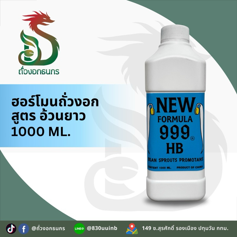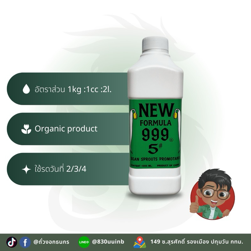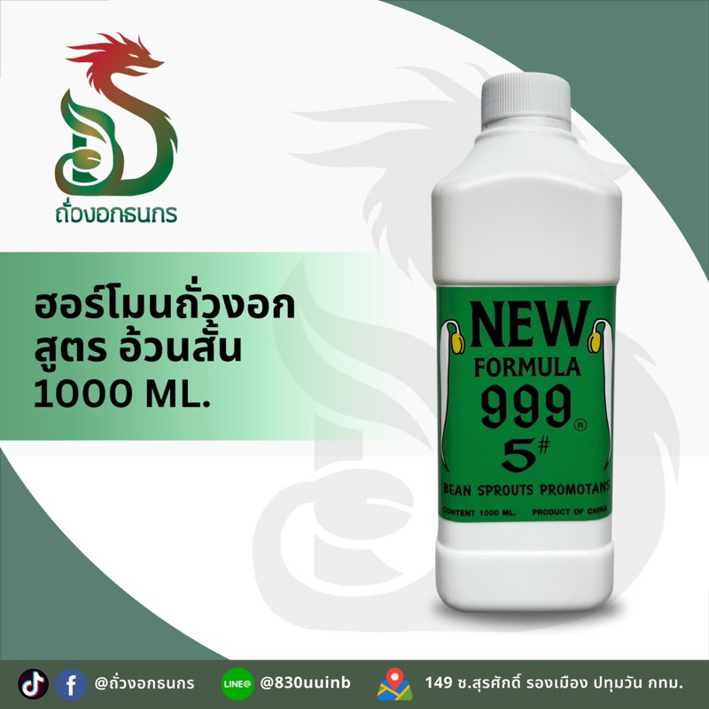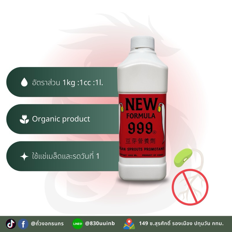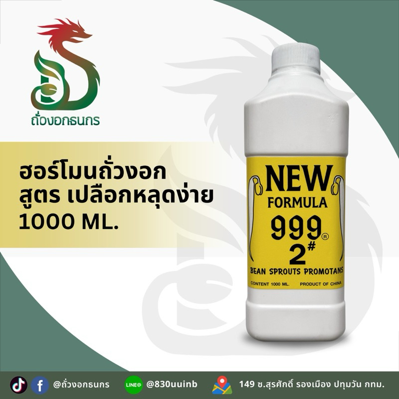 ... 9 [สีแดง] = ช่วยทำให้ถั่วงอกมีรากสั้น และจะทำให้ถั่วงอกมีน้ำหนักมากขึ้น ใช้สำหรับแช่กัดรากเมล็ดถั่วงอก **ใช้สำหรับรดปุ๋ยครั้งแรกและครั้งที่สอง** 3. New Formula 999 [สีฟ้า] = ทำให้ลำต้นมีลักษณะ ลำต้นยาว มีน้ำหนักมากขึ้น 4. New Formula 999 [สีเหลือง] = ช่วยทำให้เปลือกดำหลุดออกง่ายขึ้นเวลาล้างถั่ว **อัตราส่วน ถั่วงอก 1 กก. = น้ำ 1 ลิตร = ฮอร์โมน 999 2 CC. [รดฮอร์โมนตามวงรอบของปุ๋ยที่ใส่] วิธีใช้งาน 1. รดปุ๋ยครั้งแรก หลังจากที่เพาะถั่วลงถังแล้ว 12 ชม. 2. รดปุ๋ยครั้งที่สอง หลังจากที่ทิ้งไว้ห่างจากครั้งแรก 12 ชม. 3. รดปุ๋ยครั้งที่สาม ทิ้งห่างหลังจากครั้งที่สอง 24 ชม. 4. รดปุ๋ยครั้งที่สี่ ทิ้งห่างจากครั้งที่สาม 24 ชม. **หมายเหตุ** หากต้องการสอบถามรายละเอียดวิธีการใช้งานเพิ่มเติม สามารถสอบถามแอดมิน ผ่านทางแชทกับร้านค้าได้เลยค่ะ หากลูกค้าสนใจสินค้า หรือต้องการสอบถามเพิ่มเติมเกี่ยวกับถั่วงอก วิธีใช้ การใช้ฮอร์โมน หรืออื่นๆ สามารถสอบถามแอดมินผ่านทางการแชทกับร้านค้า หรือสามารถติดตามเพจ FACEBOOK : ถั่วงอก ธนกร @greenbeen.mai สามารถขอคำปรึกษาได้ ฟรี** ทักสอบถามได้ตลอด 24 ชม. ค่ะ