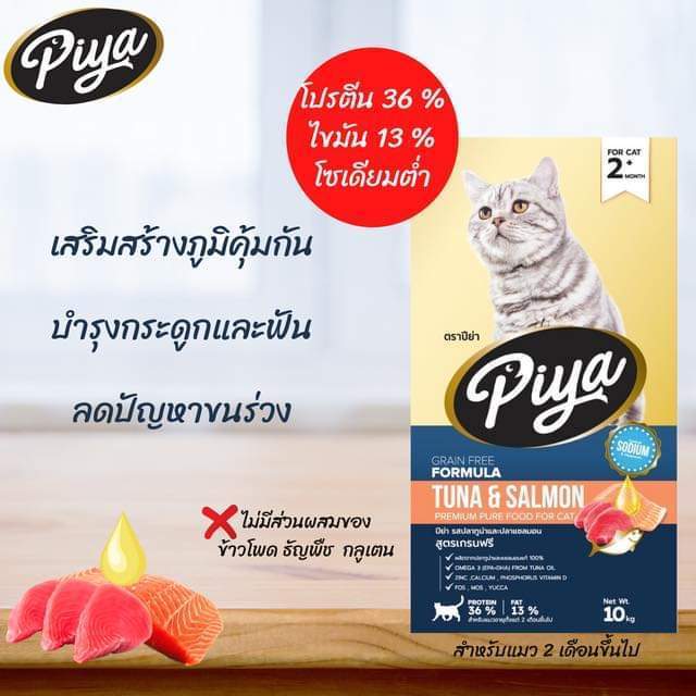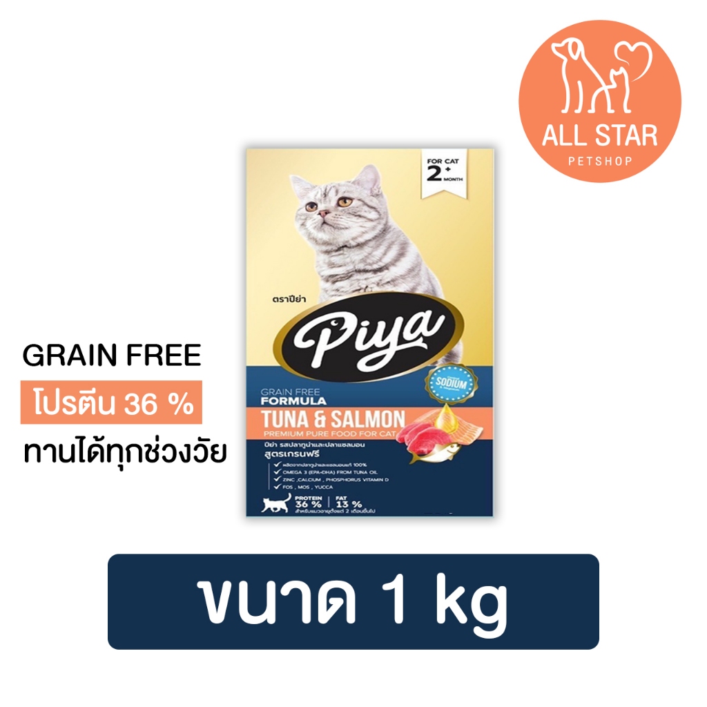 ใหม่ PIYA Grain Free อาหารแมว ปีย่า เกรนฟรี ทานได้ทุกช่วงวัย ขนาด 1 kg - ผลิตจากปลาทูน่าและปลาแซลมอนแท้ 100 % - ผิวหนังและขนแข็งแรง - กระดูกและฟันแข็งแรง - เสริมสร้างภูมิคุ้มกันและป้องกันการอุดตันของก้อนขน - ลดกลิ่นมูล บำรุงการขับถ่าย - โซเดียมต่ำ