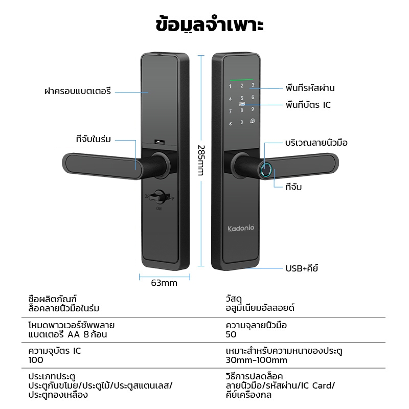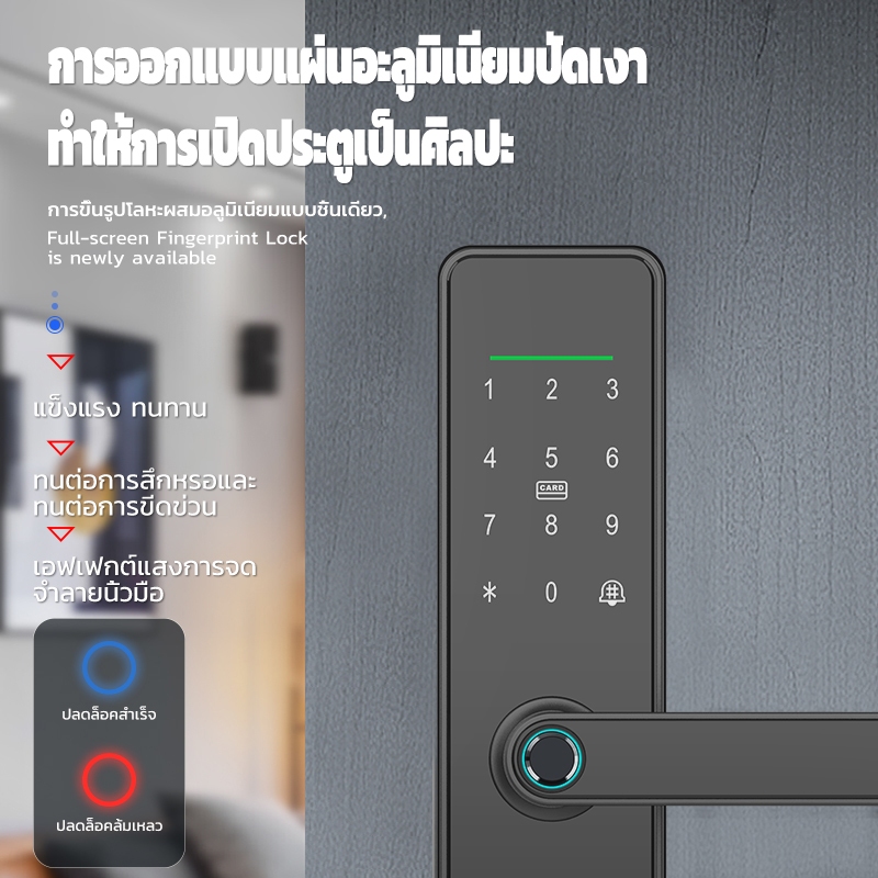 ... ถล็อคจากด้านใน 2. เพิ่มฟังก์ชั่นออดไม่จำเป็นต้องซื้อออดพิเศษ 3. ใช้พลังงานจากแบตเตอรี่อัลคาไลน์ AA 1.5V 8 ก้อนอายุการใช้งานยาวนานเป็นพิเศษ, แต่ยังสามารถใช้งานได้หลังจากติดตั้ง 4 ก้อน 1. Fingerprint ลายนิ้วมือ 2. Password รหัสผ่าน 3. IC Card การ์ด IC 4. Mechanical Key กุญแจเครื่องกล 5. เสียงเตือนของภาษา:อังกฤษ/ชาวจีน/ภาษาไทย (Language:English / Chinese/Thai) ✅ ลายนิ้วมือและรหัสผ่าน ขนาดรหัส: 6-8 หลัก ลายนิ้วมือ + รหัสผ่าน + บัตร IC: 512 กลุ่ม; ปริมาณความจำลายนิ้วมือ:100 กลุ่ม การกำหนดค่าผู้ดูแล: 9 คน; เวลาปลดล็อกเวลาปลดล็อก: 1 วินาที ✅ หน้าที่ | ฟังก์ชั่นฟังก์ชั่นฟังก์ชั่นฟังก์ชั่น สัญญาณเตือนแรงดันไฟฟ้าต่ำ / สัญญาณเตือนแบตเตอรี่ต่ำ รหัสผ่านเสมือนจริง แหล่งจ่ายไฟสำรอง USB / แหล่งจ่ายไฟฉุกเฉิน USB / แหล่งจ่ายไฟฉุกเฉิน USB โดยปกติโหมดเปิด / ล็อคจะเปิดอยู่เสมอ �� ก่อนสั่งซื้อคุณต้องวัด 1 ความหนาของประตูและความหนาของ "ตัวล็อคตัวเรือน" 2 ความยาวด้านข้างของตัวล็อค 3 ความกว้างของรูประตู 4 ระยะห่างจากกึ่งกลางของ รูประตูไปที่ขอบประตู คุณต้องวัดระยะห่างระหว่างรูประตูสองรู + ความสูงรวมของถังล็อคสองถังเข้าด้วยกัน) ถ่ายภาพและส่งไปให้พนักงานของเรา คุณสามารถติดต่อเจ้าหน้าที่ของเราผ่าน "แชทเลย" ◕ สำหรับประตูเดียวประตูอลูมิเนียมประตูไม้ประตูกระจกกรอบอลูมิเนียมประตูเหล็ก (ความกว้างล็อคอัจฉริยะคือ 60 มม. ตัวล็อคมีหลายขนาดโปรดตรวจสอบ "ขนาด" ในภาพสุดท้ายก่อนสั่งซื้อ เพื่อให้แน่ใจว่าคุณใช้ "ร่อง" ที่พอดีกับประตูของคุณ) �� ไม่สามารถใช้กับประตูกระจกประตูบานเลื่อนได้ เหมาะอย่างยิ่งสำหรับวัสดุแข็งเช่นประตูไม้ประตูเหล็กประตูอลูมิเนียม ฯลฯ เนื่องจากต้องเจาะ หากคุณต้องการล็อคอัจฉริยะสำหรับ "ประตูกระจกบานเลื่อนพร้อมกรอบ" โปรดติดต่อเราทาง "แชท" เราจะส่งลิงค์ให้คุณ ☔ สำหรับใช้ภายในอาคารเท่านั้นสำหรับการติดตั้งกลางแจ้งโปรดเก็บให้ห่างจากความชื้นของน้ำหรือแสงแดดโดยตรงขอแนะนำให้เพิ่มฝาครอบป้องกัน เมื่อติดตั้งกลางแจ้งโดยไม่มีการป้องกันแสงแดดและมาตรการป้องกันน้ำเราจะไม่รับผิดชอบต่อปัญหาใด ๆ) ��ต้องดูก่อนสั่งซื้อ ประตูหนา ^ 3 ซม. ความหนาของประตู