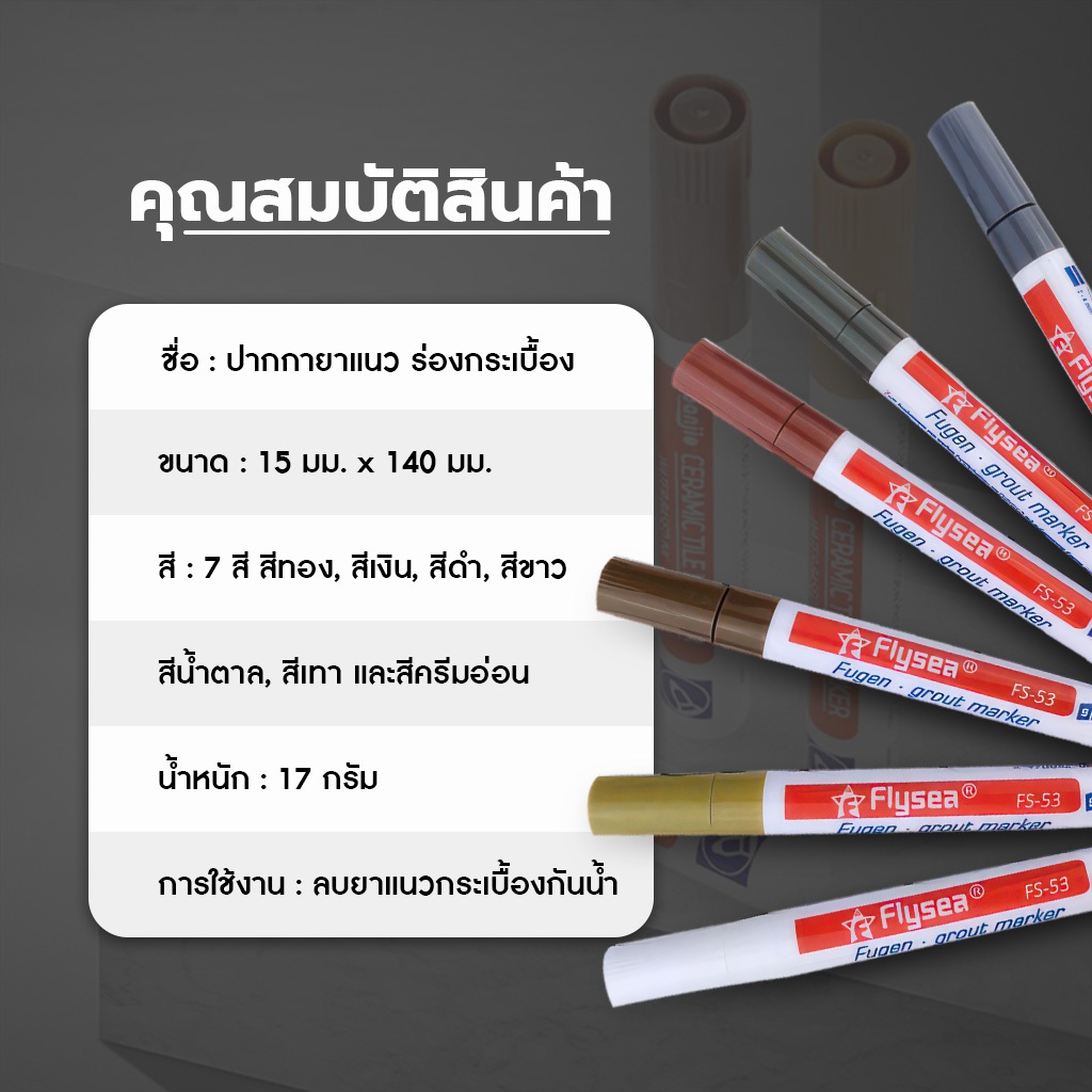 ... ที่เกิดจากเชื้อรา ⭐️น้ำหมึกปลอดสารพิษ ปลอดภัย เป็นมิตรกับสิ่งแวดล้อม ⭐️หัวขนาด 2.0mm สีเนียน กันน้ำ แห้งง่าย ป้องกันความชื้น ⭐️ความยาวด้าม 14CM. ⭐️ 1ด้าม ใช้ได้ ประมาณ 100เมตร 🔥วิธีใช้🔥 1) เขย่าปากกา 2) กดหัวปากกาเข้าไปจุ่มหมึกในแท่ง แล้วน้ำหมึกจะไหลออกมา 3) พร้อมใช้งาน เขียนร่องยาแนว สามารถเอาผ้ามาเช็ดในส่วนที่เลอะได้ *หมายเหตุ* ปากกายาแนวเป็นปากกาน้ำหมึก สำหรับเปลี่ยนสียาแนวเก่าเป็นใหม่ ไม่ใช่เนื้อครีม ไม่สามารถเติมเต็มร่องที่สึกกร่อนได้** 👉 ส่งสินค้าภายใน 1-2 วัน ทุกวันยกเว้นวันอาทิตย์ 👉 ส่งจากกทม. ในเขตกทม ประมาณ1-2 วัน // ต่างจังหวัด 3-4 วัน 👉 หากยังไม่ได้รับพัสดุ ทางร้านแนะนำให้รอเพิ่มอีก 1-2 วัน หรือติดต่อขนส่งได้โดยเร็วที่สุดที่ Shopee โทร 02-017-8399 🚚 ก่อนสั่งซื้อ รบกวนคุณลูกค้าตรวจสอบข้อมูลการจัดส่ง ให้เรียบร้อย เพื่อความรวดเร็วและถูกต้องในการจัดส่งนะคะ :) 🙏 หากพึงพอใจกับสินค้าและบริการ ลูกค้าสามารถให้คะแนน 5 ดาว ⭐️⭐️⭐️⭐️⭐️ เป็นทุนกำลังใจให้พวกเราทุกคนนะคะ กรณีที่พบเจอปัญหาทักแชทมาหาเราได้เลย ตลอด 24 ชั่วโมงทางร้านยินดีช่วยเหลือค่ะ 😊 *** ขอบคุณที่ไว้วางใจร้าน Yomi.home ให้เป็นส่วนหนึ่งในการใช้ชีวิตให้ง่ายขึ้น สะดวกขึ้นนะคะ ***