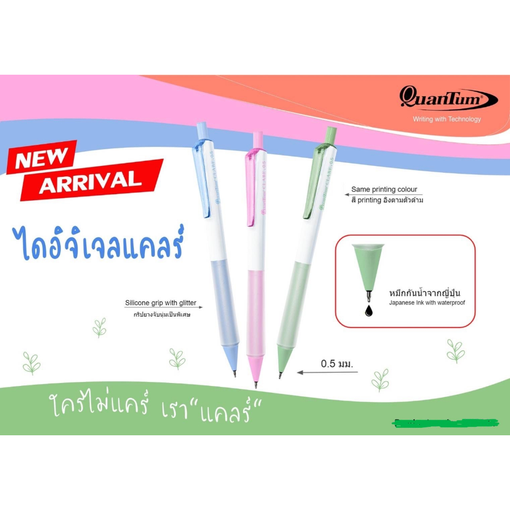 🌟 ร้าน TTT Shops สามารถออกใบกำกับภาษี/ใบเสร็จรับเงิน สำหรับใช้เบิกโรงเรียนหรือบริษัทได้ โดยไม่มีการชาร์จเพิ่ม 💫 ลูกค้าสามารถแจ้งรายละเอียดในแชท หลังการสั่งซื้อและชำระเงินได้เลยครับ 🌈 มีโค้ดลดราคาเพิ่มทุกเดือน ติดตามที่หน้าแรกของร้าน ปากกาเจล Quantum รุ่น CLARE แคลร์ ขนาด 0.5 mm. ด้ามจับนุ่ม หมึ