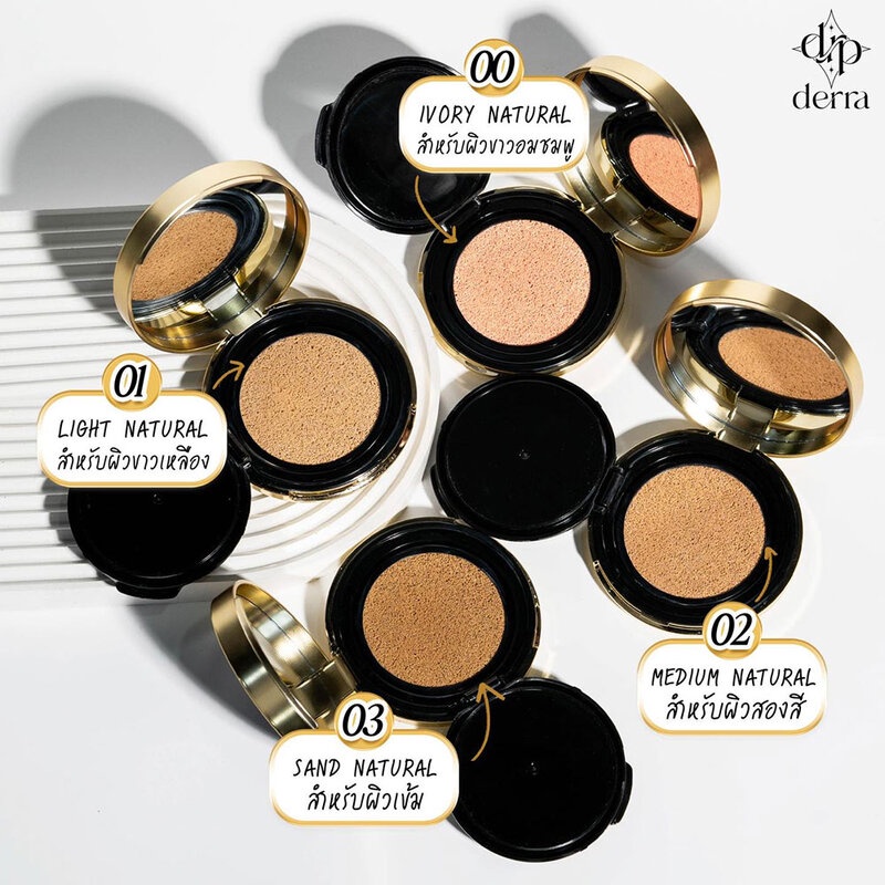 Cr.facebook.com/DerraThailand derra Glowy And Coverskin Cushion SPF 25 PA+++ 10gตลับเดียวครบจบ ผิวสวยฉ่ำโกลว์กับคุชชั่นเดอร์ร่า เนื้อแมท บางเบา มอบการปกปิดได้ดี ควบคุมความมัน กันน้ำ กันเหงื่อ ติดทนนาน เพื่อผิวฉ่ำน้ำเนียนสวย •สูตรผิวแพ้ง่ายหรือเป็นสิวโดยเฉพาะ •เนื้อแมทบางเบา เกลี่ยง่าย •ช่วยควบ
