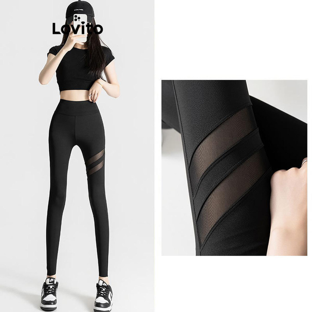 Lovito เลกกิ้งผู้หญิง สีพื้น แต่งผ้าตาข่าย สไตล์สปอร์ต LNE59082
