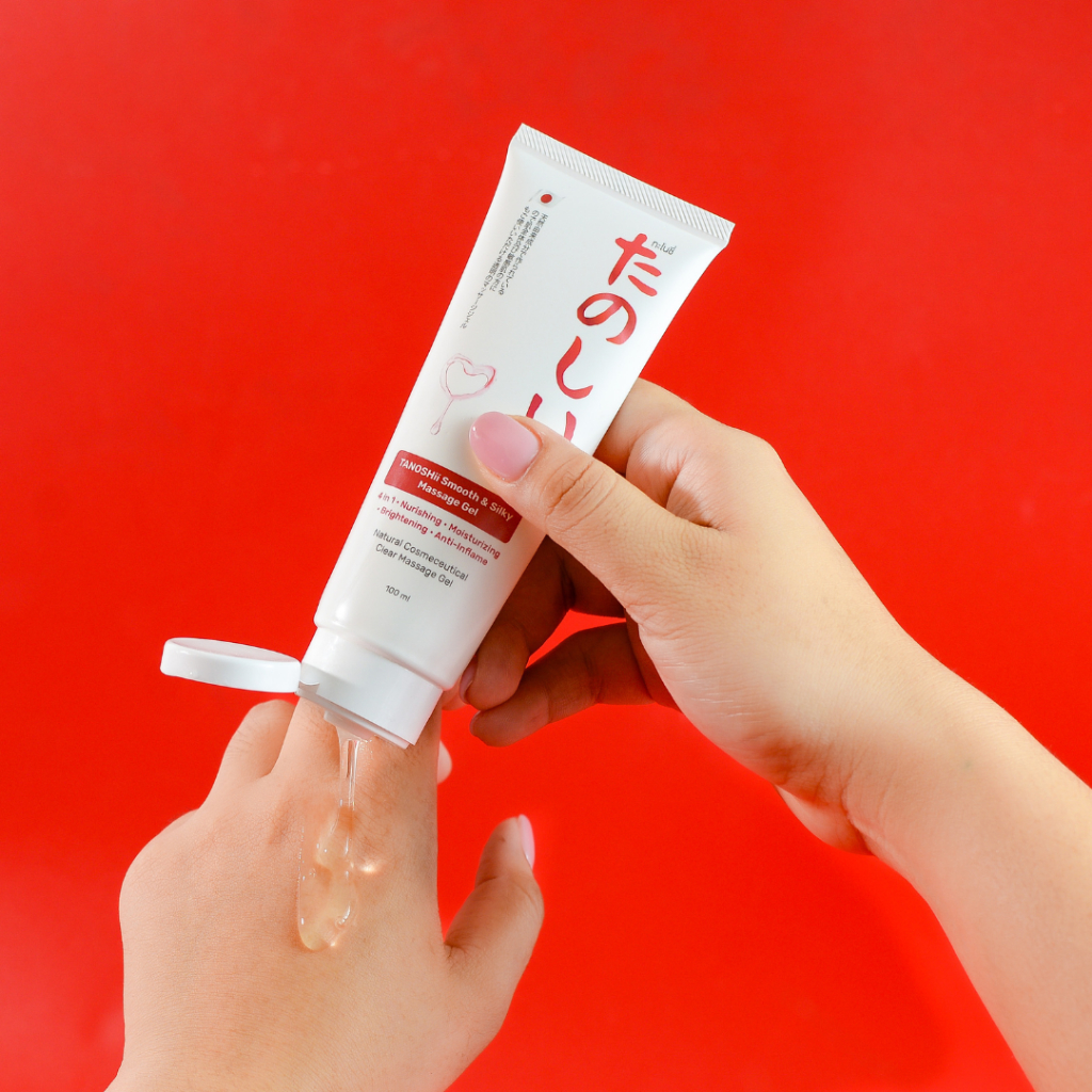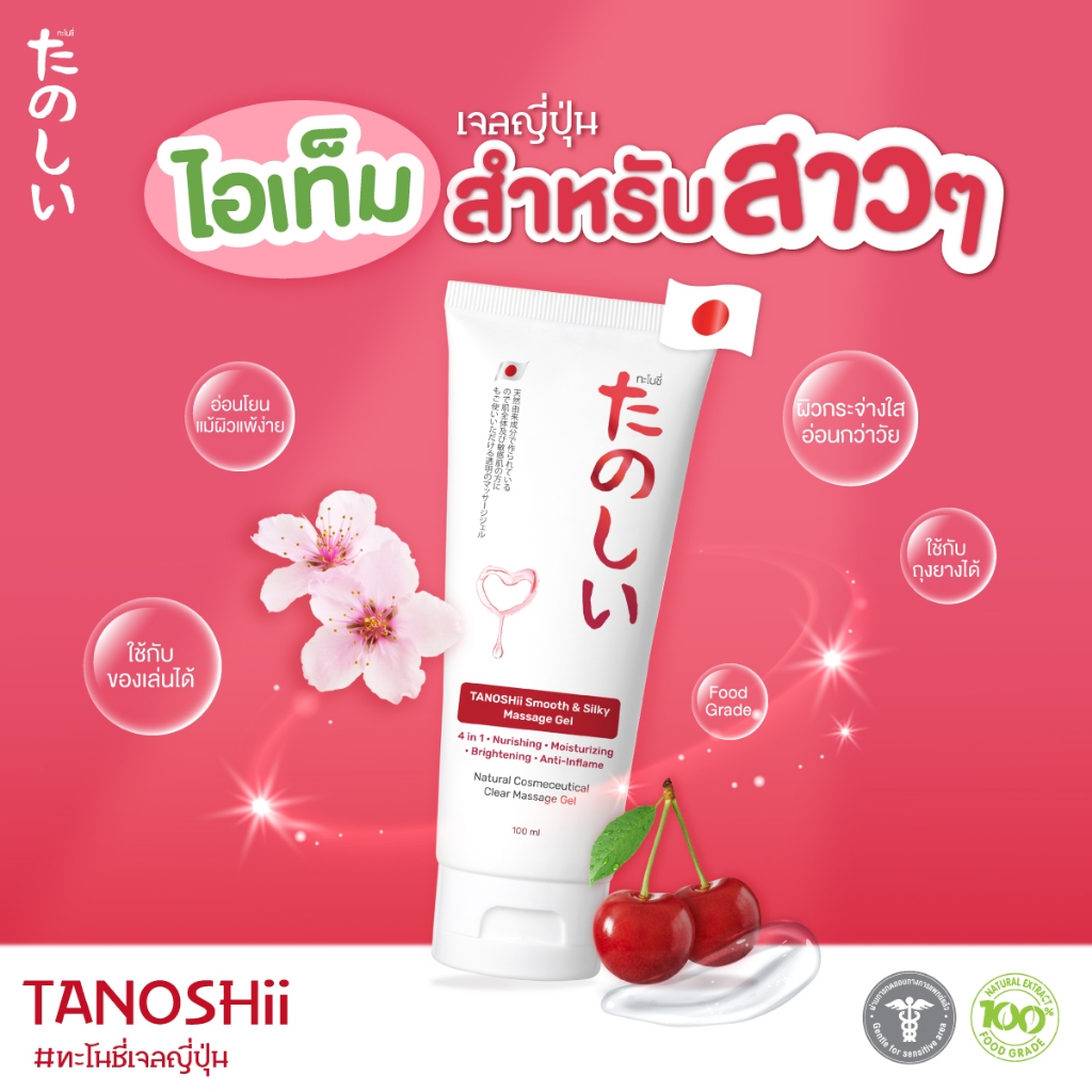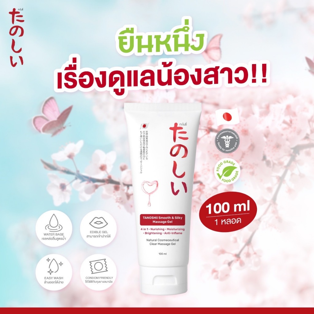 TANOSHii SMOOTH & SILKY MASSAGE GEL 100ml. ทะโนชี่สมูท แอนด์ ซิลค์กี้ มาสสาจ เจล เจลหล่อลื่นญี่ปุ่นสูตรสกินแคร์ ✨ลดแสบ ลดคัน ลดอักเสบ ต่อต้านแบคทีเรีย ✨ ผิวกระจ่างใส อ่อนกว่าวัย ✨ อ่อนโยนแม้ผิวแพ้ง่าย ✨ Food Grade ✨ ใช้กับถุงยางได้ ✨ ใช้กับของเล่นเกรดซิลิโคนได้ " สนุกได้ไม่ต้องเติมระห