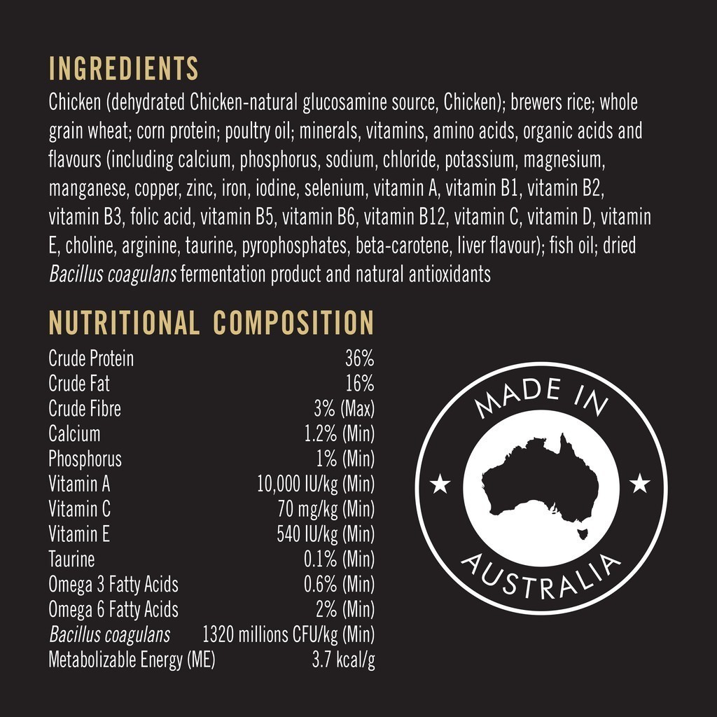 ... ถุดิบที่ใช้เป็นส่วนผสมอาหารสัตว์ : ไก่ป่น, บริเวอร์ไรซ์, ข้าวสาลีเมล็ด, โปรตีนข้าวโพด, ไขมันสัตว์ปีก, แร่ธาตุ, วิตามิน, กรดอะมิโน, กรดอินทรีย์, สารปรุงแต่งกลิ่นรส, ผลพลอยได้จากไก่ป่น, น้ำมันปลา, บาซิลัสโคแอกกูแลน (โพรไบโอติค), สารถนอมคุณภาพอาหารสัตว์ คุณภาพอาหารสัตว์ทางเคมี : โปรตีน ไม่น้อยกว่า 34%, ไขมัน ไม่น้อยกว่า 15% กาก ไม่มากกว่า 3%, ความชื้น ไม่มากกว่า 9% วิธีและขนาดการใช้ : แสดงในตารางด้านหลังถุง (ปริมาณอาหารที่ให้อาจเปลี่ยนแปลงได้ตามขนาด, อายุ, สายพันธุ์และกิจกรรมของแมว ควรเก็บอาหารในภาชนะที่ปิดมิดชิดในที่แห้งและเย็น และควรจัดน้ำสะอาดให้แมวตลอดเวลา)