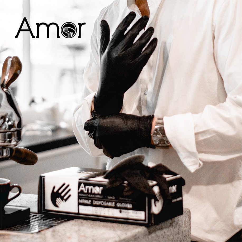 (ส่งฟรี) ถุงมือสำหรับร้านกาแฟ Amor หนาพิเศษ ถุงมือทำอาหาร Food Grade ถุงมือร้านสัก ผลิตจากยางไนไตรสีดำ 100 ชิ้น/กล่อง