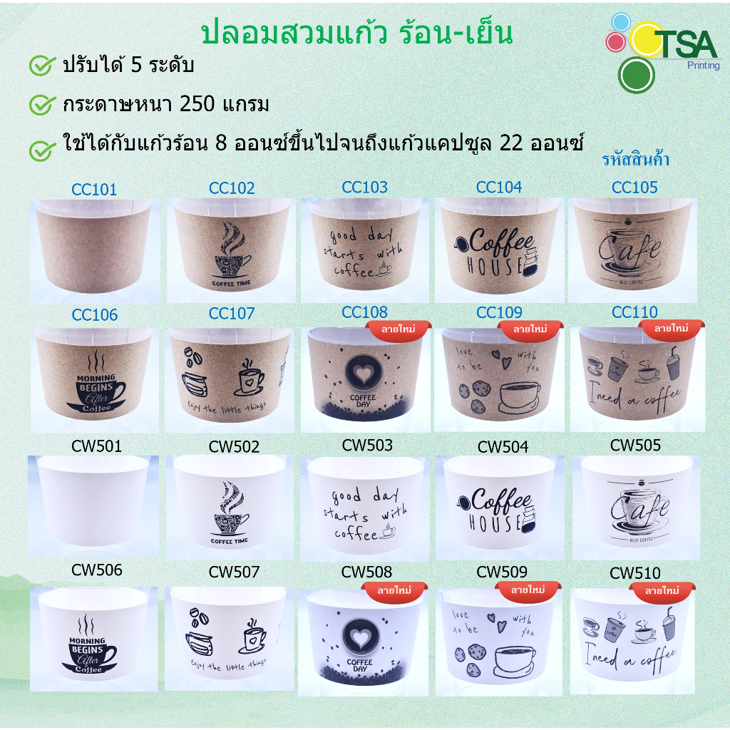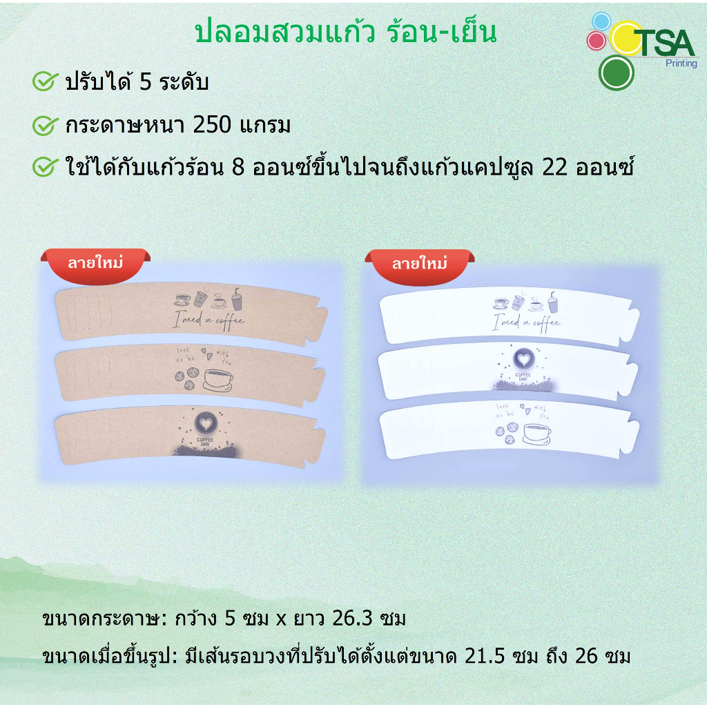 ... ้นรูปง่าย ประหยัดเวลา ✅️ ย่อยสลายตามธรรมชาติ หรือนำมารีไซเคิลได้ เป็นมิตรต่อสิ่งแวดล้อม ขนาดกระดาษเมื่อกางออก: กว้าง 5 ซม x ยาว 26.3 ซม ขนาดกระดาษเมื่อขึ้นรูป: มีเส้นรอบวงที่ปรับได้ตั้งแต่ขนาด 21.5 ซม ถึง 26 ซม (คุณลูกค้าลองวัดเทียบกับขนาดเส้นรอบวงตรงกลางแก้วที่ต้องการสวมปลอกกระดาษนะคะ) ใช้ได้กับแก้วร้อน 8 ออนซ์ขึ้นไปจนถึงแก้วแคปซูล 22 ออนซ์ สินค้าพร้อมส่ง จัดส่งภายใน 1-2 วัน ตัดรอบ 9.00 น. ของทุกวัน จัดส่งทุกวันจันทร์-เสาร์ ยกเว้นวันอาทิตย์และวันหยุดนักขัตฤกษ์ #ปลอกสวมแก้ว #ปลอกแก้วกระดาษ #ปลอกแก้วกาแฟ #coffee #กาแฟ #ชานม #cupsleeve