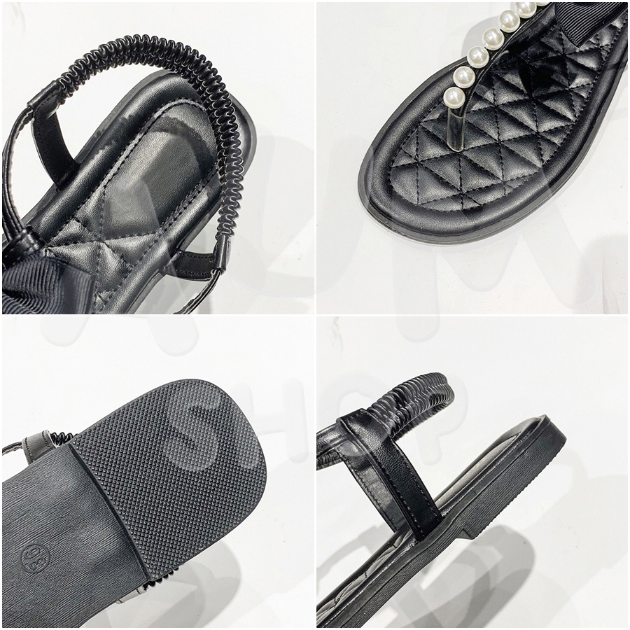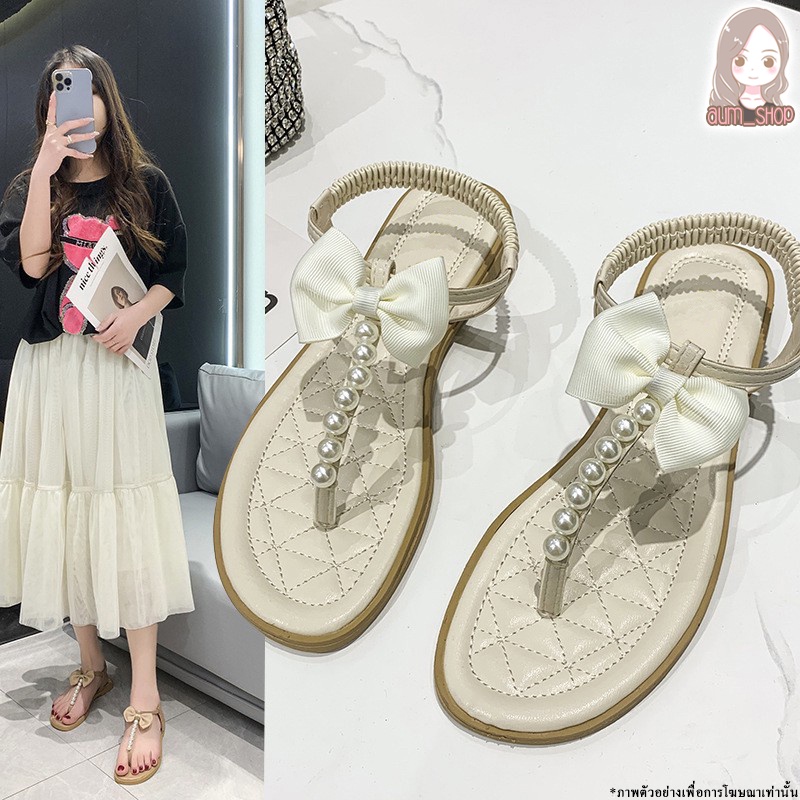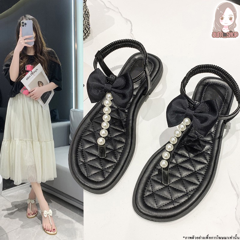 รองเท้ายางรัดส้น แต่งมุกผูกด้วยโบว์ ใส่สบาย ทรงน่ารัก T100