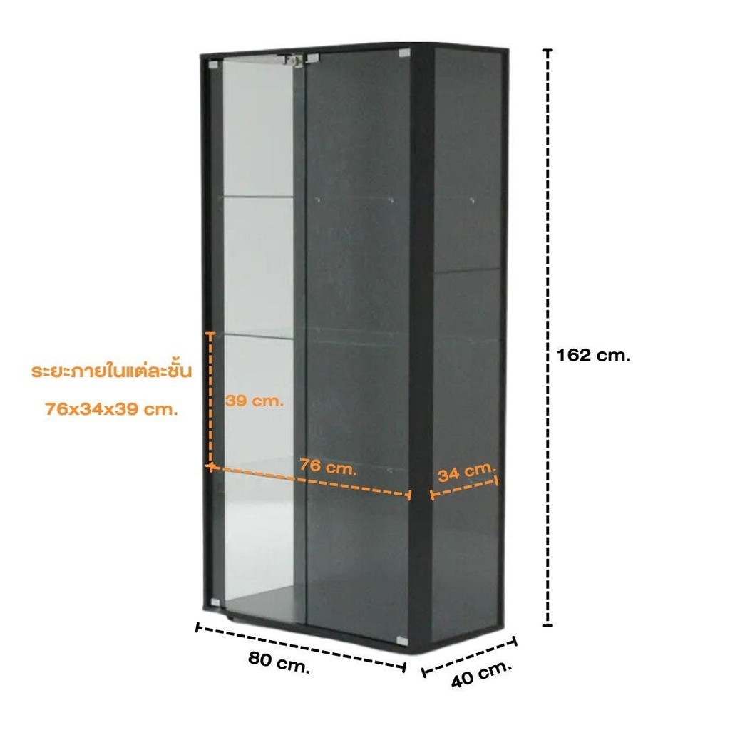... 40 สูง 160 ซม. - มีให้เลือก 2 ขนาด (40 ซม. เเละ 80 ซม.) 2 สี (ขาวและดำ) - โครงตู้ผลิตจากไม้ - บานประตูสามารถล็อกได้ - กระจกทั้งตู้เป็นกระจกนิรภัย เพื่อความปลอดภัยของผู้ใช้งาน - สามารถใส่ของได้อย่างหลากหลายถึง 4 ชั้น - เหมาะสำหรับโชว์เครื่องประดับ ของเก่า หรือของสะสม รวมไปถึงของมีค่าอื่นๆ การดูแลรักษา : - ไม่วางสินค้าในสภาวะที่อุณหภูมิเปลี่ยนแปลงรวดเร็วเพื่อป้องกันการแตกตัวของเนื้อกระจก - หลีกเลี่ยงการกรีด ขูดขีด ด้วยของแข็งและของมีคม - ใช้ผ้าชุบน้ำบิดหมาดหรือน้ำยาเช็ดกระจกทำความสะอาดเท่านั้น - ควรจัดวางให้ไกลจากเด็ก เพื่อความปลอดภัย หมายเหตุ 1. เมื่อลูกค้าทำรายการชำระเงินสำเร็จ จะได้รับ SMS จาก SBDesignSq ยืนยันคำสั่งซื้อ พร้อมลิงก์เลือกเปลี่ยนวันจัดส่ง ก่อนจัดส่งสินค้า จะมีเจ้าหน้าที่โทรติดต่อยืนยันวันและเวลาจัดส่งอีกครั้ง 2. เมื่อมียอดสั่งซื้อครบ 5,000 บาทขึ้นไป บริการจัดส่งและติดตั้งฟรี (เฉพาะสินค้าที่ร่วมรายการ เงื่อนไขภายใต้บริษัทกำหนด) หากมียอดสั่งซื้อต่ำกว่า 5,000 บาท มีค่าบริการจัดส่งและติดตั้งตามพื้นที่จัดส่งของลูกค้า 3. สินค้าจัดส่งภายใน 10-14 วัน เฉพาะกรุงเทพและปริมณฑล, จัดส่งภายใน 15 - 30 วัน สำหรับพื้นที่ต่างจังหวัด (เขตพื้นที่ดอย ภูเขา จะใช้เวลาจัดส่งนานกว่าปกติ) 4. หากไม่มีผู้รับสินค้าในวันที่จัดส่งสินค้า ทางบริษัทฯ จำเป็นต้องขนสินค้ากลับโรงงาน ซึ่งทำให้มีค่าใช้จ่ายในการขนส่งขากลับและนำกลับมาส่งใหม่อีกครั้ง โดยคิดค่าบริการ (รอบสอง) สำหรับสินค้าน็อคดาวน์ครั้งละ 1,500 บาท 5. กรณีจัดส่งและติดตั้งบนคอนโดหรืออาคาร โดยไม่มีลิฟต์ขนส่งหรือสินค้าไม่สามารถนำเข้าลิฟท์ได้ พนักงานจะขนสินค้าขึ้นทางบันได บริการยกสินค้าขึ้นให้ฟรี ระหว่างชั้นที่ 1-5 มากกว่าชั้นที่ 5 ขึ้นไป คิดค่าบริการเพิ่มชั้นละ 200 บาท (เริ่มนับจากชั้นที่รถวนขึ้นไม่ได้) 6. ขอสงวนสิทธิ์จัดส่งสินค้า 1 คำสั่งซื้อ ต่อ 1 สถานที่จัดส่งเท่านั้น 7. ขอสงวนสิทธิ์ในการยกเลิกการคำสั่งซื้อ พื้นที่ที่ไม่สามารถจัดส่งได้ ได้แก่ จังหวัดยะลา จังหวัดปัตตานี จังหวัดนราธิวาส และพื้นที่บนเกาะ 8. ขอสงวนสิทธิ์ในการยกเลิกการคำสั่งซื้อ หากพบว่าระบบมีการแสดงราคาที่ผิดปกติ หรือเกิดข้อผิดพลาดภาพและข้อมูลจากระบบ โดยไม่ต้องแจ้งให้ทราบล่วงหน้า และขออภัยมา ณ โอกาสนี้ 9. ขอสงวนสิทธิ์ไม่รับเปลี่ยนสินค้า คืนสินค้า คืนเงิน กรณีที่สินค้าประกอบติดตั้งแล้ว หากลูกค้ายืนยันเปลี่ยนสินค้า คืนสินค้า คืนเงิน ลูกค้าต้องรับผิดชอบค่าส่งสินค้าคืนและมูลค่าสินค้าที่เสื่อมสภาพ 30% ของราคาสินค้า (กรุณาทักแชทติดต
