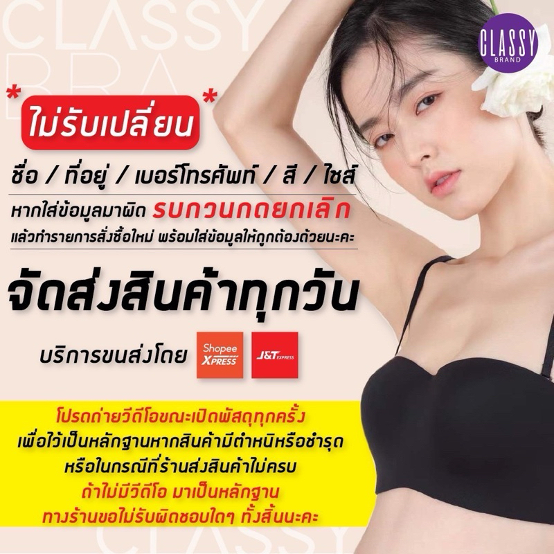 ... 4/75,36/80,38/85 -ฟองน้ำหนา 0.5 ซ.ม -ไร้โครง ไร้ตะเข็บ บางเบา เรียบเนียน -เฉดสีใส่ง่าย ขายดีทุกๆๆสี -แนะนำเลยใส่สบายมากๆๆๆ -ทรงสวย เต้าตื้น -ถนอมทรง แนบเนื้อ -รอบตัวบางเบาไม่รัด เนียบกับทุกชุด การดูแลรักษา : แยกชุดชั้นใน สีเข้ม-อ่อน ใช้น้ำอุณหภูมิปกติ หลีกเลี่ยงการใช้น้ำร้อนและน้ำอุ่น ใช้น้ำยาซักชุดชั้นในหรือสบู่สูตรอ่อนโยน หากซักเครื่อง แนะนำให้แยกใส่ถุงถนอมผ้า จัดส่งสินค้า : จันทร์-อาทิตย์ *** หลักเกณฑ์การสั่งซื้อสินค้า ** 1.จัดส่งสินค้าตามลำดับคำสั่งซื้อที่ได้รับ ส่งสินค้าทุกวัน จันทร์-อาทิตย์ 2.ลูกค้าควรระบุที่อยู่ในการจัดส่งสินค้าให้ชัดเจน เพื่อขนส่งจะได้จัดส่งได้รวดเร็วและถูกต้อง 3.หากมีการใส่ที่อยู่หรือเบอร์โทรผิด ทางร้านไม่สามารถแก้ไขข้อมูลของลูกค้าได้ ลูกค้าต้องกดยกเลิกและทำการสั่งซื้อใหม่ 4.เพื่อผลประโยชน์ของลูกค้า รบกวนถ่ายวีดีโอตอนแกะพัสดุ และนับจำนวนสินค้าว่าครบถ้วนหรือไม่ หากเกิดข้อผิดพลาดจากทางร้าน ให้ใช้วีดีโอนี้ในการเครม ไม่มีวีดีโองดเครมทุกกรณี *** กรณีการเปลี่ยนสินค้า *** 1. หากเกิดจากความผิดของทางร้าน เช่น ส่งผิดรุ่น/ผิดสี/ผิดไซส์ ทางร้านยินดีให้เปลี่ยนสินค้าโดยทางร้านจะรับผิดชอบเรื่องค่าใช้จ่ายเอง 2. หากเกิดจากความผิดของลูกค้า เช่น สั่งผิดไซส์/ผิดสี/ผิดรุ่น ลูกค้าต้องรับผิดชอบค่าใช้จ่ายเองทั้งหมด 3.สินค้าประเภท กางเกงชั้นใน กางเกงซับใน กางเกงกระชับพุง ( ที่ใช้กับจุดซ่อนเร้น ) ขอสงวนสิทธิ์ไม่รับเปลี่ยน/คืน ในทุกกรณี ผู้ซื้อไม่อาจยื่นคำร้องขอคืนสินค้าและ/หรือคืนเงิน เนื่องจากเปลี่ยนใจหรือได้ทดลองสวมใส่แล้ว เพื่อสุขอนามัยที่ดี 4.สินค้าที่ตัดป้าย ผ่านการซัก ไม่สามารถขอเปลี่ยนและคืนสินค้าได้ หมายเหตุ -ขนาดของสินค้าอาจคลาดเคลื่อนเล็กน้อยขึ้นอยู่กับการผลิตในแต่ละล็อต -สีจริงของสินค้าอาจคลาดเคลื่อนเล็กน้อย เนื่องจากการแสดงผลของหน้าจอที่แตกต่างกัน Underwire bra, thin bubble, A cup, smooth bottom color work. All around is borderless work, seamless, smooth, light, comfortable to wear, does not push the shape, cares for the breasts, soft to the touch, works with two hooks, removable strap Size 32/70,34/75,36/80,38/85 Cup A - smooth - Frameless, comfortable - Shallow breast, beautiful shape - Nude tones, easy to wear