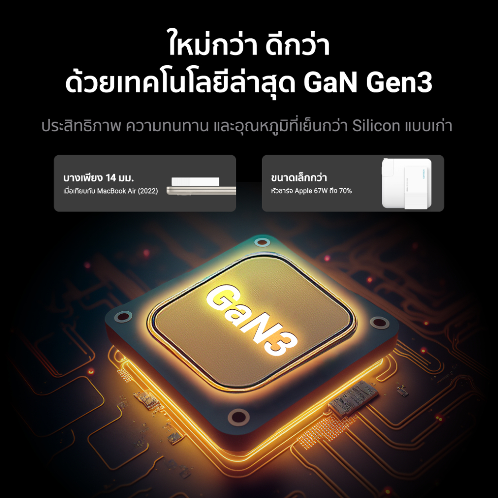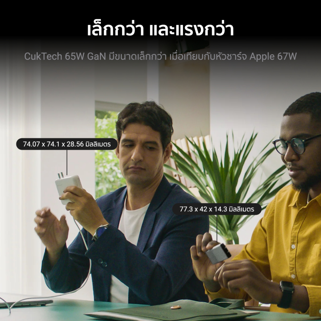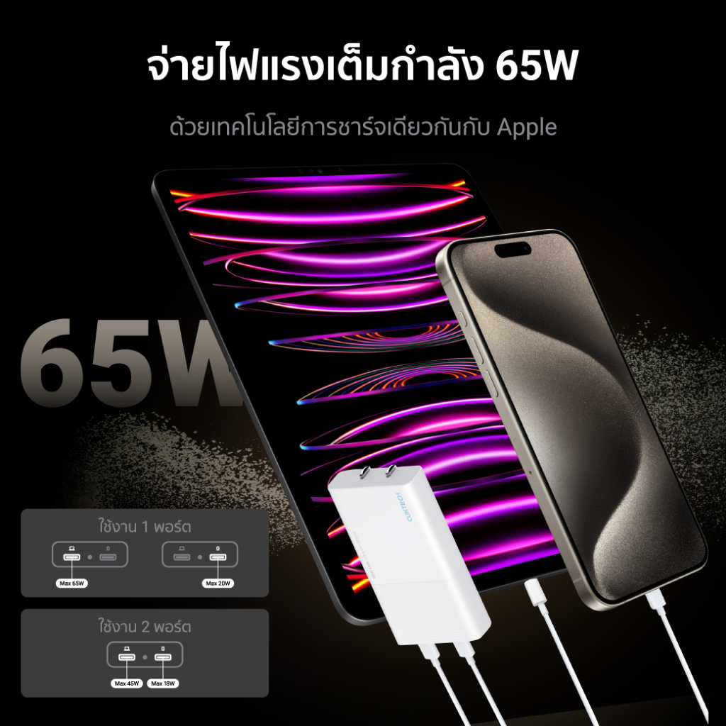 ... ่าหัวชาร์จประเภท Silicon - รองรับการชาร์จไว สำหรับ iPhone , iPad , MacBook * iPhone 14 Pro Max เต็ม 0-100% ใน 1 ชม. 35 น. * iPad Pro 11 นิ้ว เต็ม 0-100% ใน 1 ชม. 48 น. * สามารถใช้งานกับ มือถือ, แท็บเล็ต, แล็ปท็อป, Switch และอื่นๆ - ขนาดเล็ก พกพาง่าย มีความบางเพียง 1.06 เซนติเมตร * พับขาได้ พกใส่กระเป๋าได้ง่าย ไม่สร้างรอยขีดข่วน - เทคโนโลยี TOB ในการจัดเรียงแผงวงจร ทำให้ เล็กบาง และไม่ร้อน - มั่นใจได้มากกว่าด้วยระบบความปลอดภัยถึง 8 ชั้น [[ ข้อมูลสินค้า ]] แบรนด์ : CukTech รุ่น : CukTech GaN 45W Model : AC45B Input1 : 220-240V ~ 50/60Hz 0.8A Output1 : 5V𝌂3A , 9V𝌂3A , 12V𝌂2.5A , 15V𝌂2A 20V𝌂2.25A Input2 : 100-130V ~ 50/60Hz 0.8A Output2 : 5V𝌂2.4A , 9V𝌂2A , 12V𝌂1.67A , 15V𝌂1.33A 20V𝌂1A ขนาดสินค้า : 61.5 x 38 x 10.6 มิลลิเมตร [[ อุปกรณ์ภายในกล่อง ]] 1x CukTech GaN 45W 1x คู่มือการใช้งาน --------------------------------- 2.) CukTech AC65B GaN 65W หัวชาร์จ USB-C 1 ช่องชาร์จ [[ จุดเด่นสินค้า ]] - เทคโนโลยีการชาร์จหลักของโลก PD3.0 , QC3.0 , AFC * รองรับการจ่ายกระแสไฟได้สูงสุดถึง 65W ด้วยพอร์ต USB-C - เล็กกว่า ประสิทธิภาพเหนือกว่าด้วยเทคโนโลยี GaN Gen 3 * เย็นกว่า ทนทานกว่าหัวชาร์จประเภท Silicon - รองรับการชาร์จไว สำหรับ iPhone , iPad , MacBook * iPhone 14 Pro Max เต็ม 0-100% ใน 1 ชม. 35 น. * iPad Pro 11 นิ้ว เต็ม 0-100% ใน 1 ชม. 48 น. * สามารถใช้งานกับ มือถือ, แท็บเล็ต, แล็ปท็อป, Switch และอื่นๆ - ขนาดเล็ก พกพาง่าย มีความบางเพียง 1.45 เซนติเมตร * มีขนาดเล็กกว่าหัวชาร์จ Apple 61W ถึง 70% * CukTech 65W GaN (71.3 x 43.8 x 14.5 มม.) * Apple 61W (74.1 x 74.1 x 28.6 มม.) * พับขาได้ พกใส่กระเป๋าได้ง่าย ไม่สร้างรอยขีดข่วน - เทคโนโลยี TOB ในการจัดเรียงแผงวงจร ทำให้ เล็กบาง และไม่ร้อน - มั่นใจได้มากกว่าด้วยระบบความปลอดภัยถึง 7 ชั้น * ระบบป้องกันกระแสไฟฟ้าเข้าเกิน * ระบบป้องกันกระแสไฟฟ้าออกเกิน * ระบบป้องกันการเกิดเปลวไฟ * ระบบป้องกันสัญญาณรบกวน * ระบบป้องกันแรงดันไฟฟ้าเกิน * ระบบป้องกันอุณหภูมิเกิน * ระบบป้องกันไฟฟ้าลัดวงจร - ใช้งานได้รอบโลก ด้วยการรับแรงดันไฟที่ 100 - 240V * ไฟแรงดัน 220 - 240V จ่ายไฟได้สูงสุด 65W * ไฟแรงดัน 100 - 130V จ่ายไฟได้สูงสุด 45W [[ ข้อมูลสินค้า ]] แบรนด์ : CukTech รุ่น : CukTech GaN 65W USB-C 1 Port Model : AC65B Input1 : 100-130V ~ 50/60Hz 1.5A Output1 (C1) : 5V𝌂3A , 9V𝌂3A , 12V𝌂3A , 15V𝌂3A 20V𝌂2.25A 45W Max Input2 : 200-240V ~ 50/60Hz 1.2A Output2 (C1) : 5V𝌂3A , 9V𝌂3A , 12V𝌂3A , 15V𝌂3A 20V𝌂3.25A 65W Max ขนาดสินค้า : 71.3 x 43.8 x 14.5 มิลลิเมตร น้ำหนัก : 76 กรัม [[ อุปกรณ์ภายในกล่อง ]] 1x CukTech GaN 65W USB-C 1 Port 1x คู่มือการใช้งาน -------------------------- 3.CukTech AC65B2 GaN 65W หัวชาร์จ USB-C 2 ช่องชาร์จ [[ จุดเด่นสินค้า ]] - เล็กกว่า ประสิทธิภาพเหนือกว่าด้วยเทคโนโลยี GaN Gen 3 * เย็นกว่า ทนทานกว่าหัวชาร์จประเภท Silicon - เทคโนโลยีชาร์จ PD3.0 , QC3.0 , PPS 3A , Super Fast Charge (PD & PPS) * 2 พอร์ต USB-C (USB-C1 65W & USB-C2 20W) * ชาร์จ 2 พอร์ตพร้อมกัน (USB-C1 45W & USB-C2 18W) - ขนาดเล็ก พกพาง่าย มีความบางเพียง 1.43 เซนติเมตร * มีขนาดเล็กกว่าหัวชาร์จ Apple 67W ถึง 70% * CukTech 65W GaN (77.3 x 42 x 14.3 มม.) * Apple 67W (74.1 x 74.1 x 28.6 มม.) * พับขาได้ พกใส่กระเป๋าได้ง่าย ไม่สร้างรอยขีดข่วน - เทคโนโลยี TOB ในการจัดเรียงแผงวงจร ทำให้ เล็กบาง แล