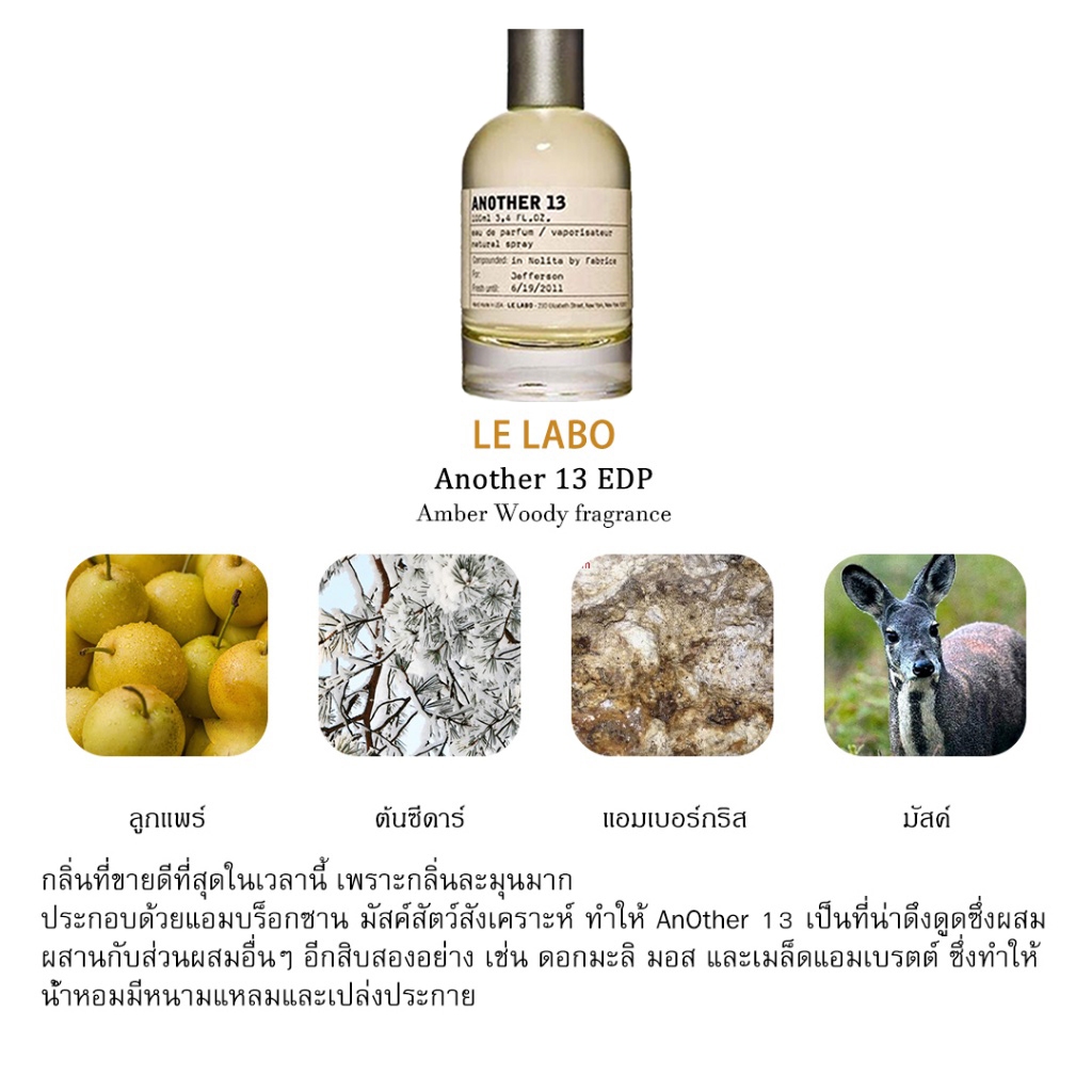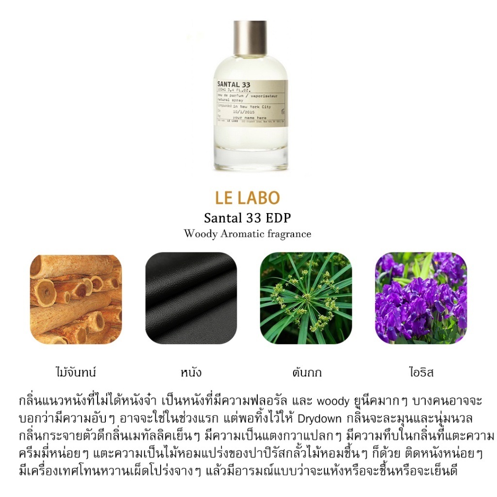 ... ัญหาใดๆ เกี่ยวกับผลิตภัณฑ์โปรดติดต่อเรา เราจะพยายามอย่างดีที่สุดเพื่อตอบสนองความต้องการของคุณ 👍👍👍Le Labo Another 13 EDP👍👍👍 Fragrance: Woody Oriental ท็อปโน๊ต: pear, mandarin, apple. โน๊ตกลา: anemone, amyl salicylate, oakmoss, jasmine. โน๊ตฐานr: Ambergris Ketone, Super Ambergris Ether, Hepha Musk, Wasabi Lactone. 👍👍👍Le Labo Santale 33 EDP👍👍👍 Fragrance: Woody Fougere ท็อปโน๊ต: Sandalwood, Snow Pine. โน๊ตกลา: Cardamom, Violet, Tanned Leather, Amber. โน๊ตฐานr: Can be used for both genders. 🔥🔥🔥Le Labo The Matcha 26🔥🔥🔥 Fragrance: Woody ท็อปโน๊ต: FIG matcha cedar. โน๊ตกลา: bitter orange vetiver. โน๊ตฐานr: Neutral fragrance. 🔥🔥🔥Le Labo Gaiac 10 Tokyo🔥🔥🔥 Fragrance: Woody Fougere ท็อปโน๊ต: Woody. โน๊ตกลา: Musk, Guiac, Cedarwood, Frankincense. โน๊ตฐานr: Can be used for both genders. 💖Le Labo Baie 19👍 Fragrance: Floral notes ท็อปโน๊ต: Tuberose lily. โน๊ตกลา: jasmine vanilla. โน๊ตฐานr: Musk wood. 💖Le Labo Rose 31👍 Fragrance: Woody floral ท็อปโน๊ต: rose, cumin. โน๊ตกลา: rose, vetiver, cedar. โน๊ตฐานr: Guaiac Wood Musk, Frankincense, Labdanum, Agarwood. 💖 Le Labo The Noir 29 EDP👍 Fragrance: Fougere ท็อปโน๊ต: bergamot, fig, bay leaf. โน๊ตกลา: cedarwood, vetiver, musk. โน๊ตฐานr: hay, tobacco. 💖 Le Labo Bergamote 22 EDP Fragrance: Woody Fougere ท็อปโน๊ต: Amber, Vetiver, Musk, Grapefruit. โน๊ตกลา: Bergamot, Orange Blossom, Snow Pine. โน๊ตฐานr: Can be used for both genders. 💖Le Labo Lys 41 Fragrance: Floral notes ท็อปโน๊ต: Scent: Tuberose lily. โน๊ตกลา: jasmine vanilla. โน๊ตฐานr: Musk wood. 💖Le Labo Iris 39 Fragrance: Floral chypre ท็อปโน๊ต: Iris, Patchouli, Musk, Lemon. โน๊ตกลา: Rose, Ylang Ylang, Violet, Ginger, Cardamom, Musk. โน๊ตฐานr: Can be used for both genders. 💖Le Labo Vetiver 46 EDP Fragrance: Woody ท็อปโน๊ต: Llabdanum, Vetiver, Pepper, Snow Pine. โน๊ตกลา: Frankincense, Bergamot Amber, Vanilla Clove. โน๊ตฐานr: Can be used for both genders. 💖Le Labo Tubereuse 40 New York Fragrance:Floral Sipple note ท็อปโน๊ต: Orange flower bergamot lemon satsuma bitter orange leaf. โน๊ตกลา: tuberose jasmine mimosa sandalwood cedar rose. โน๊ตฐานr: Oak moss yellow mallow. 💖Le Labo Vanille 44 Paris Fragrance:Wood note ท็อปโน๊ต: Vanilla. โน๊ตกลา: guaiac-wood bergamot. โน๊ตฐานr: lemon. 💖Le Labo Jasmin 17 Fragrance: Woody floral notes ท็อปโน๊ต: Neroli jasmine bitter. โน๊ตกลา: orange Neroli oil Musky vanilla. โน๊ตฐานr: rose grass beisha amber sandalwood. 💖Le Labo Ambrette 9 Fragrance: Aromatic note ท็อปโน๊ต: Yellow sunflower fruit. โน๊ตกลา: thymol, lemon. โน๊ตฐานr: amber. 💖Le Labo Ambrette 9 Fragrance: Sip wood note ท็อปโน๊ต: patchouli. โน๊ตกลา: Birch benzoin. โน๊ตฐานr: Vanilla. 💕ประเภทกลิ่นหอมและเวลาติดทน Parfum>EDP>EDT>EDC Parfum = 6-8 ชม. EDP =4-6 ชั่วโมง EDT=2-4 ชั่วโมง EDC=1-2 ชั่วโมง ✅เคล็ดลับน้ำหอม: 1. น้ำหอมควรเก็บไว้ในที่เย็นเพื่อหลีกเลี่ยงลมร้อนและแสงแดด เมื่อน้ำหอมสัมผัสกับอุณหภูมิสูง สีและกลิ่นของน้ำหอมจะเปลี่ยนไป หากต้องการเก็บไว้นานกว่านี้ ให้ห่อด้วยกระดาษแล้วใส่ในช่องแช่แข็ง 2.พยายามอย่าเขย่าขวดน้ำหอม 3. ห้ามสัมผัสขวดโดยตรงด้วยมือที่สกปรก เพราะอาจทำลายกลิ่นน้ำหอมได้เอง 4. หลังจากใช้น้ำหอมแล้วควรปิดฝาให้สนิทเพื่อป้องกันไม่ให้น้ำหอมระเหย ✅ถาม & ตอบ: Q: อายุการเก็บรักษาของน้ำหอมคือเท่าไร? A : น้ำหอมไม่มีอายุการเก็บ ขอแค่เก็บให้ถูกวิธีก็ใช้ได้นานกว่า 10 ปี กรุณาเก็บให้ห่างจากแสง สภาพแวดล้อมไม่ชื้น ไม่สามารถวางไว้ใต้เครื่องปรับอากาศได้ Q: ทำไมแอลกอฮอล์ถึงมีกลิ่นแรงจัง? A: แอลกอฮอล์เป็นพาหะของน้ำหอมและกลิ่นหอมระเหย น้ำหอมใด ๆ มีแอลกอฮอล์ประมาณ 78% หลังจากฉีดพ่นน้ำหอมแล้วรอ 1 นาทีจากนั้นจึงดมกลิ่นหลังจากที่แอลกอฮอล์ระเหยหมดแล้ว มิฉะนั้น แอล