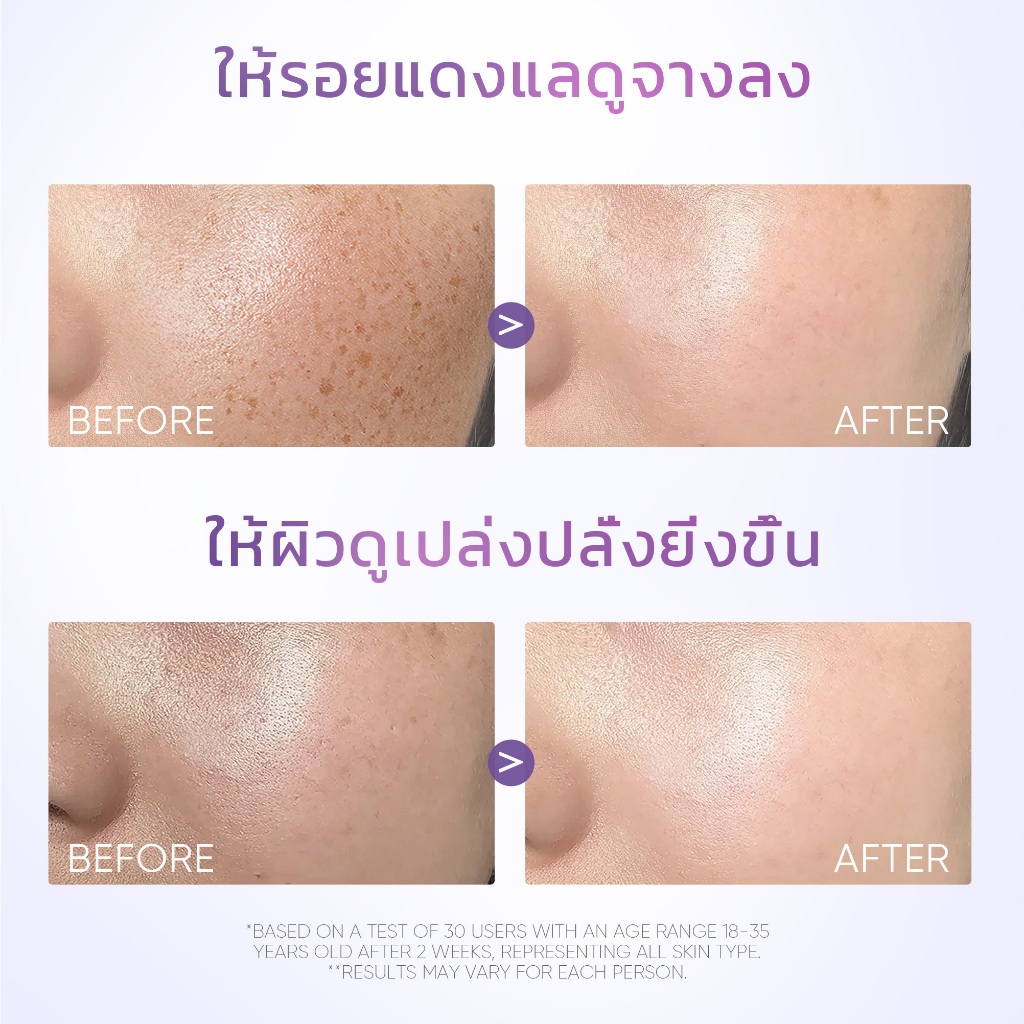 ... ุ่มชื้นเพียงพอแก่ผิวโดยไม่รู้สึกเหนียวเหนอะหนะ สูตร Triple Active พร้อม Symwhite 377 กลูตาไธโอน และ Tranexamic Acid ช่วยให้จุดด่างดำที่ฝังแน่น รอยแผลเป็นจากสิว และจุดด่างดำจางลงอย่างเห็นได้ชัด นอกจากนี้ กลูตาไธโอนยังทำหน้าที่เป็นสารต้านอนุมูลอิสระที่ป้องกันสัญญาณแห่งวัยในระยะเริ่มต้น ประโยชน์: ● จุดด่างดำแลดูกระจ่างใสขึ้น ● ทำหน้าที่เป็นสารต้านอนุมูลอิสระเพื่อป้องกันสัญญาณแห่งวัยเริ่มแรก ● ให้ความชุ่มชื้นแก่ผิวโดยไม่รู้สึกเหนียวเหนอะหนะ ● ช่วยควบคุมการผลิตน้ำมันของผิวหนัง ส่วนประกอบสำคัญ 1.SymWhite377 : จุดด่างดำจางลง 2.Glutathione : ปรับผิวให้กระจ่างใสสม่ำเสมอ และทำหน้าที่เป็นสารต้านอนุมูลอิสระ 3.Tranexamic Acid : ปรับผิวให้กระจ่างใส จุดด่างดำจางลง 4.5X Ceramide : รักษาเกราะป้องกันผิวและให้ความชุ่มชื้นแก่ผิว วิธีใช้: 1. ขอบเขตปริมาณผลิตภัณฑ์ที่เหมาะสม 2. เกลี่ยให้ทั่วใบหน้าและลำคอ 3.สามารถใช้ได้ทั้งกลางวันและกลางคืน 4.ตามด้วยครีมกันแดดในระหว่างวัน