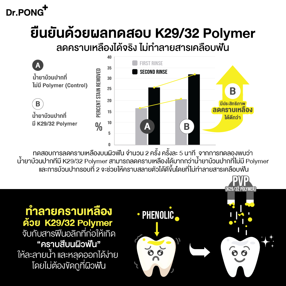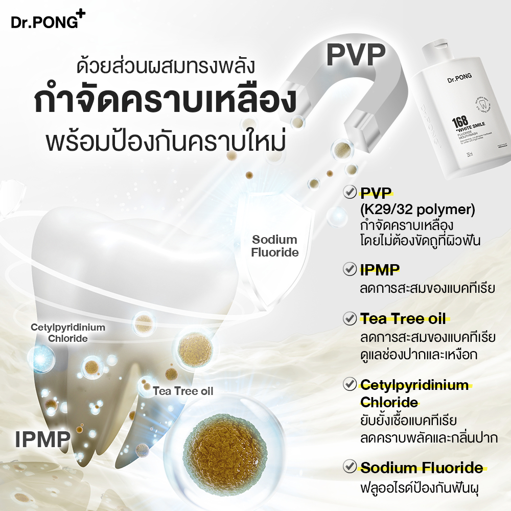 ... และป้องกันคราบใหม่ ด้วย K29/32 polymer ที่ไปจับกับคราบสีให้ละลายน้ำได้ดีขึ้นและหลุดออกจากผิวฟันอย่างอ่อนโยน . มีฟลูออไรด์ป้องกันฟันผุ ลมหายใจหอมสดชื่น ปราศจากแอลกอฮอล์ สารเพอร์ออกไซด์ น้ำตาล และ SLS . ✅วิธีใช้ : ใช้บ้วนปากเป็นประจำทุกวัน วันละ 2 ครั้ง หลังการแปรงฟันด้วยยาสีฟันที่ผสมสารขัดฟัน (Dr.PONG 9X HERBAL PLUS FLUORIDE TOOTHPASTE) กลั้วให้ทั่วปากเป็นเวลาอย่างน้อย 60 วินาที แล้วบ้วนทิ้งโดยไม่ต้องบ้วนน้ำตาม ไม่ดื่มน้ำหรือรับประทานอาหารหลังใช้อย่างน้อย 30 นาที . ✅ต้องบ้วนน้ำตามหรือไม่? ลูกค้าที่ต้องการเน้นลดคราบเหลือง เพื่อให้ฟันขาว แนะนำให้บ้วนน้ำเปล่าตาม ลูกค้าที่ต้องการเน้นป้องกันฟันผุ ให้ฟลูออไรต์ไปเคลือบฟัน แนะนำให้ไม่ต้องบ้วนน้ำตามหลังใช้ 30 นาที และสำหรับลูกค้าที่ต้องการทั้งฟันขาว และเคลือบฟันป้องกันฟันผุ แนะนำให้ใช้ 2 รอบค่ะ โดยหลังบ้วนน้ำยาทิ้งรอบแรก ให้บ้วนน้ำเปล่าตามก่อน เพื่อขจัด pvp และคราบเหลืองให้หลุดไปก่อน แล้วจึ้งบ้วนปากด้วยน้ำยาบ้วนปากอีกครั้ง และบ้วนทิ้งโดยไม่ต้องบ้วนน้ำตาม *จากการทดสอบพบว่าการบ้วน 2 รอบช่วยให้ขจัดคราบเหลืองได้ดีขึ้น . คำเตือน : ห้ามกลืน ควรเก็บให้พ้นมือเด็ก เด็กอายุต่ำกว่า 6 ปีห้ามใช้ เด็กอายุ 6-12 ปี ควรมีผู้ใหญ่ให้คำแนะนำในการใช้ PVP จะช่วยได้เฉพาะคราบที่ติดมาไม่นาน และลดการเกาะติดของคราบ ที่อาจจะเกิดขึ้นใหม่ ถ้าคราบที่ติดนานแล้ว อาจทำให้ดีขึ้นเรื่อยๆได้ แต่ต้องอาศัยแรงขัดเข้าช่วย(แนะนำใช้ร่วมกับยาสีฟัน Dr.PONG 9X HERBAL PLUS FLUORIDE TOOTHPASTE) . ✅ ปริมาณส่วนผสมหลัก • PVP(K29-32 polymer) 2.0% (Effective dose for teeth whitening) • Fluoride 226 ppm(สูงสุดที่น้ำยาบ้วนปากสามารถใส่ได้ max dose ประสิทธิภาพเท่ากับการใช้ ยาสีฟัน 1500ppm แบบล้างออกหรือไม่แปรงแห้ง) . Ingredients ✅Whitening agent • PVP (K29-32 polymer) - จับกับสารฟีนอลิกที่ก่อให้เกิดคราบสีบนผิวฟัน ให้ละลายน้ำ และหลุดออกได้ง่าย โดยไม่ต้องขัดถูที่ผิวฟัน ✅Anti-bacterial /Prevent bad breath • Cetylpyridinium chloride - ยับยั้งเชื้อแบคทีเรีย ลดคราบพลัคและกลิ่นปาก • IPMP – ลดการสะสมของแบคทีเรีย • Tea Tree oil - ลดการสะสมของแบคทีเรีย ดูแลช่องปากและเหงือก ✅Anti-cavity • Sodium Fluoride - ฟลูออไรด์ป้องกันฟันผุ