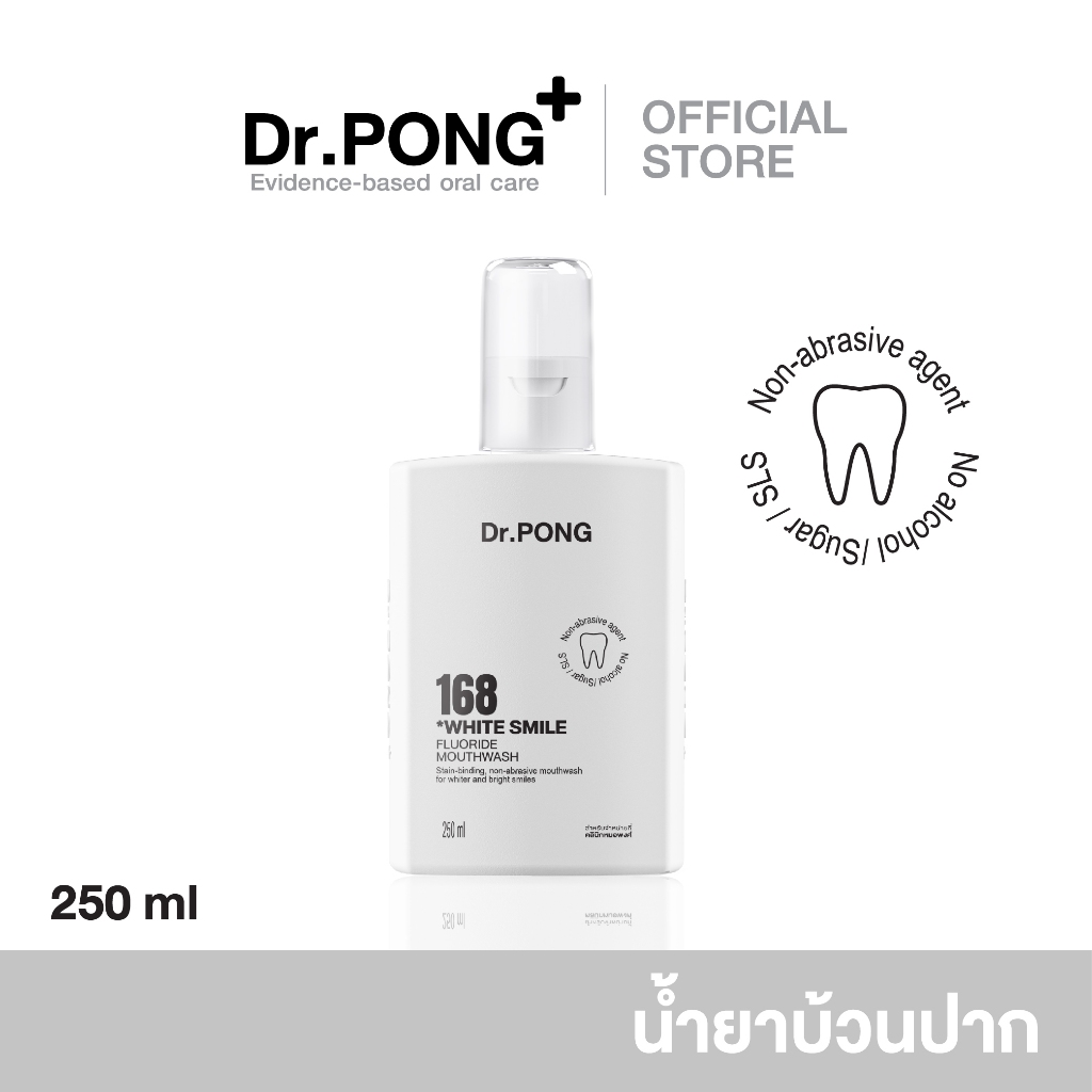 ดอกเตอร์พงศ์ 168 ไวท์ สไมล์ ฟลูออไรด์ เมาท์วอช Dr.PONG 168 white smile fluoride mouthwash . Stain-binding, non-abrasive mouthwash for whiter and brighter smiles 250 ml . ผลิตภัณฑ์บ้วนปาก เพื่อฟันขาวขึ้นอย่างเป็นธรรมชาติ โดยไม่ทำลายผิวเคลือบฟัน(Enamel) ลดปัญหาคราบเหลืองบนผิวฟันจากชากาแฟ