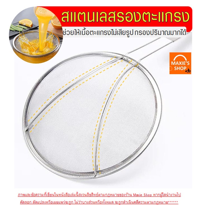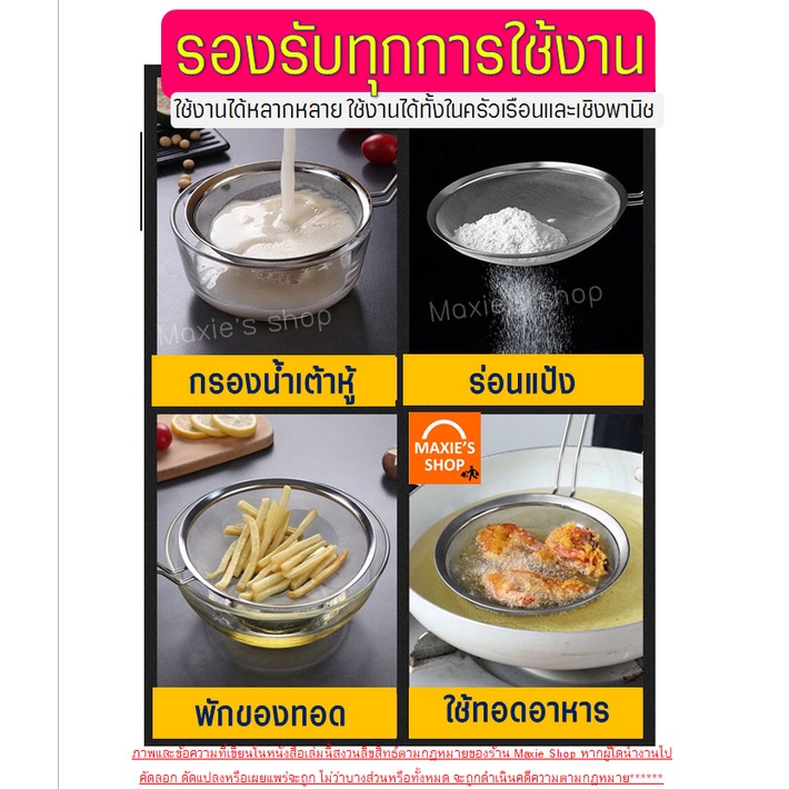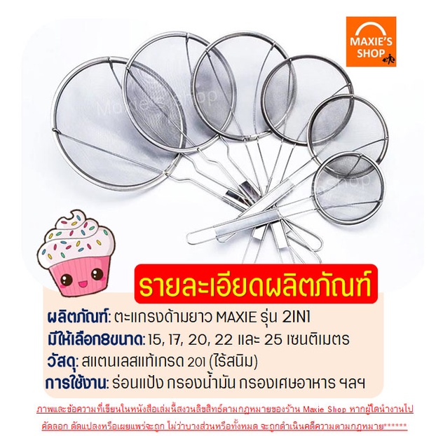 กระชอนกรอง แบบด้ามยาว สแตนเลสแท้ MAXIE มีให้เลือกถึง 5 ขนาด(แบ่งตามเส้นผ่านศูนย์กลาง) ได้แก่ 15, 17, 20, 22, 25 เซนติเมตร ผลิตจากสแตนเลสแท้ทั้งชิ้น เกรด 201 วัสดุเกรดอาหาร food grade ปลอดภัยต่อสุขภาพ พร้อมด้ามยาวแบบพิเศษ เหมาะแก่การงานลวกอาหาร หรือทอดอาหาร (ป้องกันไม่ให้น้ำมันหรือน้ำร้อนกระเด็นโด