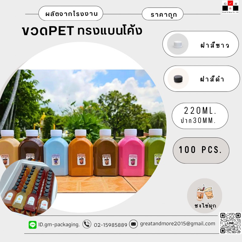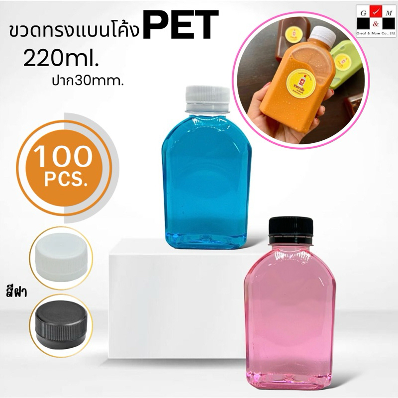 Greatandmore(แพ็ค 100ใบ) ขวดพลาสติก ขวดใส ทรงแบนโค้ง ขวด PET ขนาด 220 ml. (พร้อมฝา)