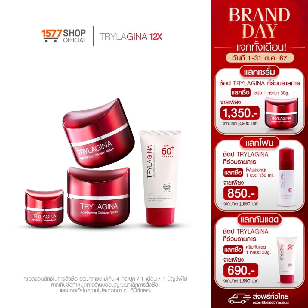 Trylagina 12X Collagen Serum ไตรลาจิน่า 12X เซรั่มคอลลาเจน 30g 2 กระปุก ฟรี เซรั่ม 5g + ครีมกันแดด สูตรใหม่