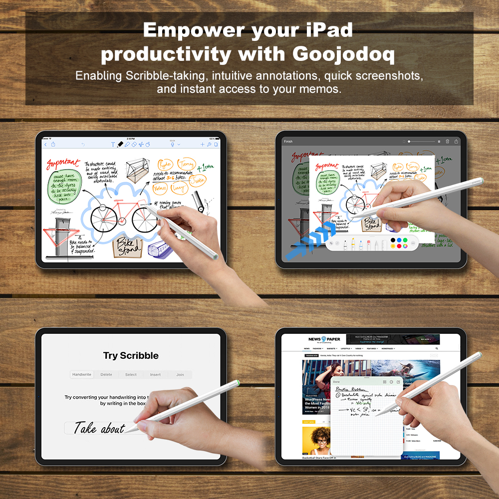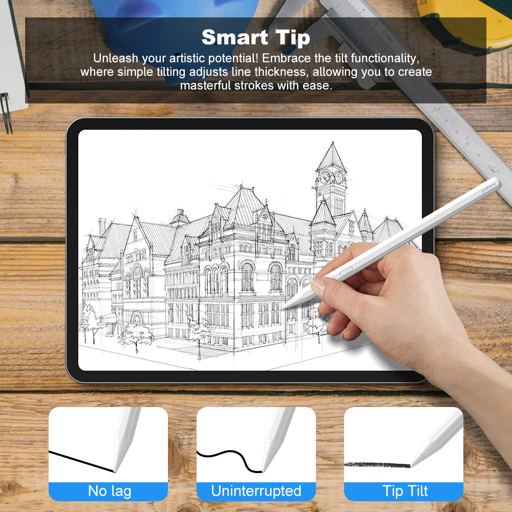 ... antly appears on the screen. Intelligent prompt Unleash your artistic potential! The tilt function of easily adjusting line thickness allows you to easily create skilled strokes. Side magnetic attraction and wireless charging Safely leave the stylus on the iPad when not in use and charge it during idle time. Tip: Tablets that support wireless charging of the stylus. This includes iPad pro-11, iPad pro-12.9, iPad air4, iPad air5, and iPad mini6. Accurate positioning point, no connection Continuously enjoy creativity! Our stylus has impeccable accuracy, providing precise positioning without worrying about disconnection or signal degradation. Durable Pom tip for durability Designed specifically for long lifespan! Durable POM material pen tip provides a smooth and consistent writing experience Using Goojodoq to power the iPad Easy to use screenshot with Scribble activation- Intuitive screenshots, fast screenshots, and instant access to your memoirs Dual mode, more convenient Quick mode automatically picks up the pen for instant writing. In normal mode, the pen light turns off after 10 seconds of power on. But it is also possible to continue writing and turn it off intelligently after being idle for five minutes to save battery life until you press the power button/ Turn off the alarm clock, it's coming again. Extending battery life One charge can work all day Perfect handwriting feel Whether you are an artist taking notes or just seeking a smooth writing experience, our stylus is your perfect companion Your iPad embraces the future of digital expression, effortlessly bringing your ideas into life. Launch iPad Stylus and unleash your creativity!